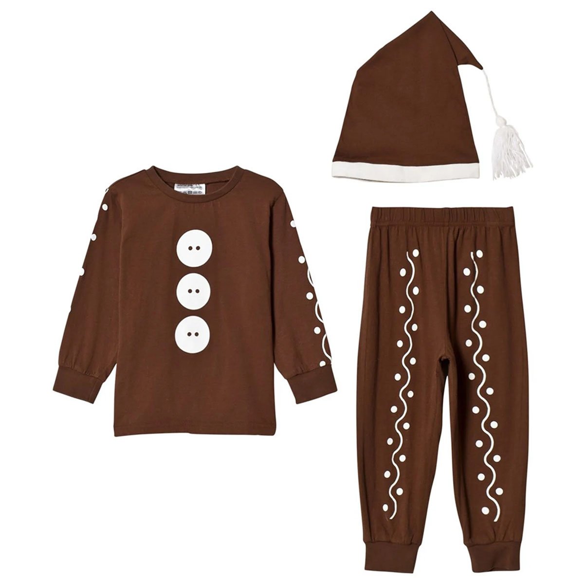 Brun pepparkaksdräkt med vita "kristyr"-detaljer som finns i flera olika storlekar. X-Small (86-92), Small (98-104), Medium (110-116) Large (122-128), X-Large (134-140), XX-Large (146-152).