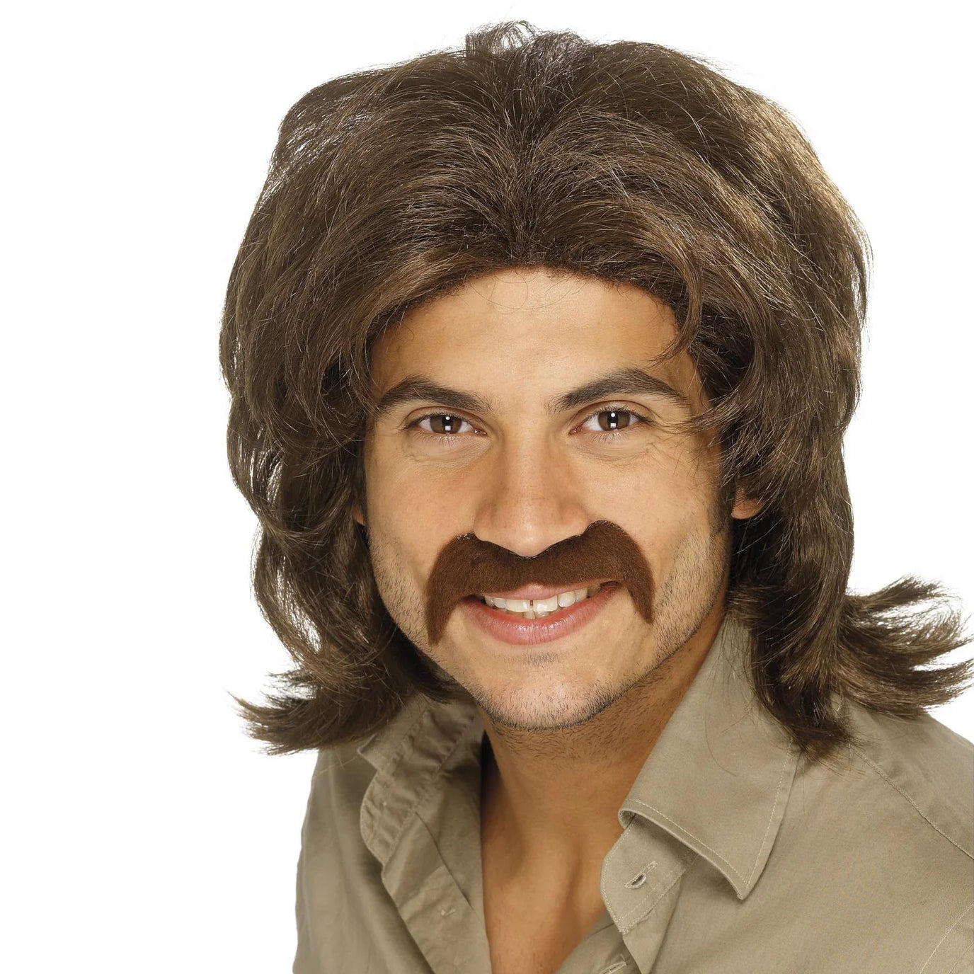 Klassisk brun retroperuk – den perfekta looken för 70- och 80-talsfester! Den långa, lätt uppklippta frisyren och den karaktäristiska mustaschen ger en autentisk vintagestil som passar utmärkt till maskerad, temafest eller disco. Peruken sitter bekvämt tack vare ett elastiskt nät som formar sig efter huvudet.