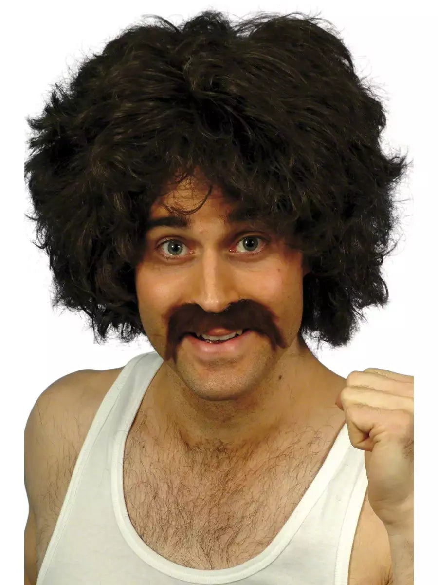 Mörkbrun peruk med rejäl volym och tillhörande mustasch – den perfekta kombon för en äkta 80-talslook! Den vilda frisyren ger en kul och igenkännbar stil som passar perfekt till maskerad, temafest eller disco. Mustaschen fästs enkelt med självhäftande baksida, och peruken sitter bekvämt tack vare ett elastiskt nät som anpassar sig efter huvudets form.