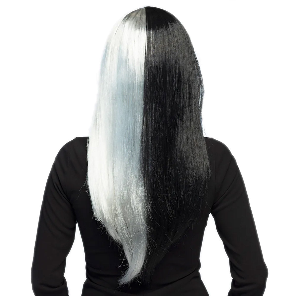 Peruk evil temptress, svart & vit med lugg är din genväg till en mörkt glamorös look med maxad wow-faktor. Den långa, raka peruken delar sig mitt på skallen – ena halvan är korpigt svart, andra halvan isande vit. Lägg till en kaxig lugg, och du har en look som osar makt, mystik och en hint av "jag får alltid som jag vill".