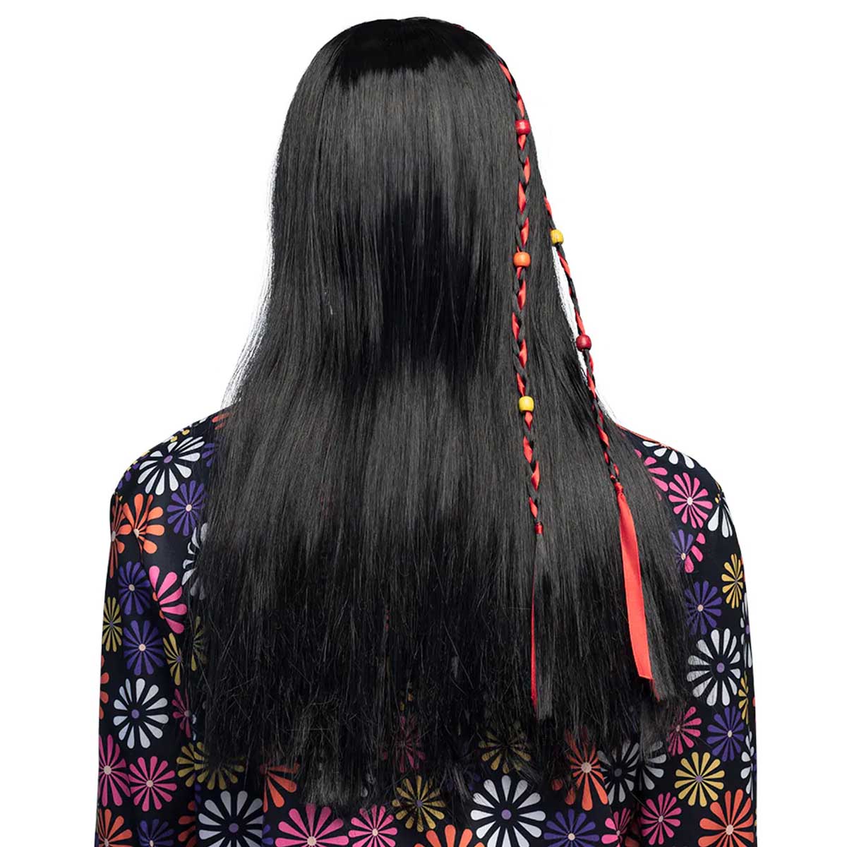 Låt din inre hippie äntligen blomstra ut med denna fantastiska flower power-peruk! Med långt, svart hår dekorerat med färgglada pärlor och band, är denna peruk den perfekta accessoaren för att ta din 60- och 70-tals look till nästa nivå. Perfekt för maskerader, temafester eller festivaler där du vill sprida lite extra kärlek och fred. Den är tillverkad av syntetiskt hår som både ser naturligt ut och är bekvämt att bära.