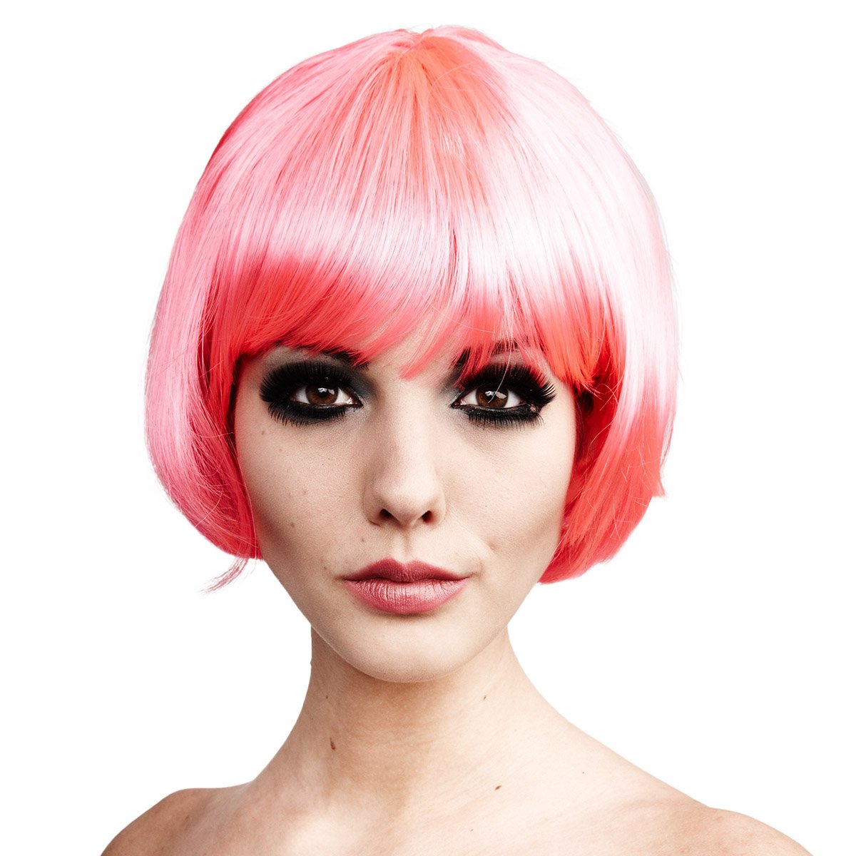 Det glansiga syntethåret reflekterar ljuset på ett sätt som gör dig till en levande neonlampa – oavsett om du är på festival, maskerad, pride eller cosplay. Den tajta bobklippningen ger ett elegant uttryck med retrovibbar, medan den rosa färgen drar åt neon-pastell för maximal wow-effekt.