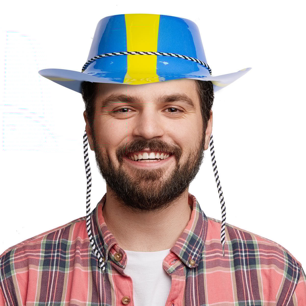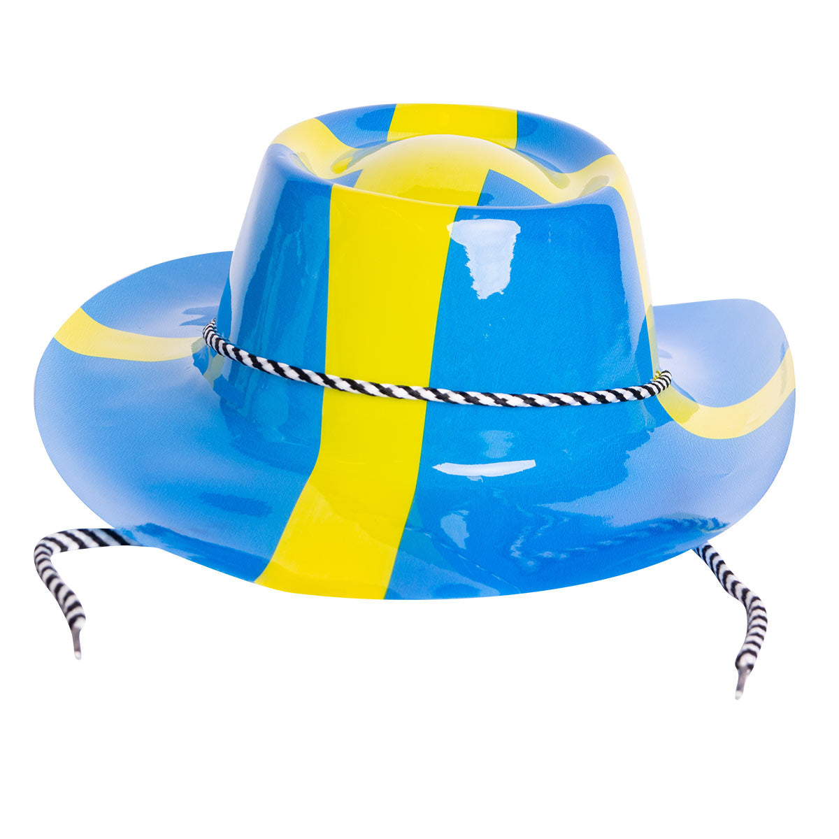 Denna cowboyinspirerande hatten med Sveriges blå/gula färger är utmärkt att använda till sportevenemang när man vill fira fram landslagen till vinst och under studenten och midsommartider. Låt sommarens färger lysa från dig starkt.