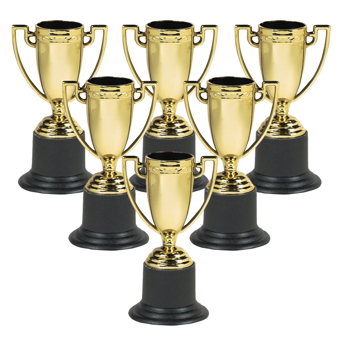 6-pack minitroféer för stora vinnare i små format! Oavsett om det gäller barnkalas, kontorslekar eller hemmagjord olympiad är dessa små guldpokaler det ultimata sättet att fira en seger med glimten i ögat. Med sina 10 cm i höjd och glansiga guldfinish med svart fot ser de precis lagom officiella ut – utan att ta sig själva på för stort allvar.
