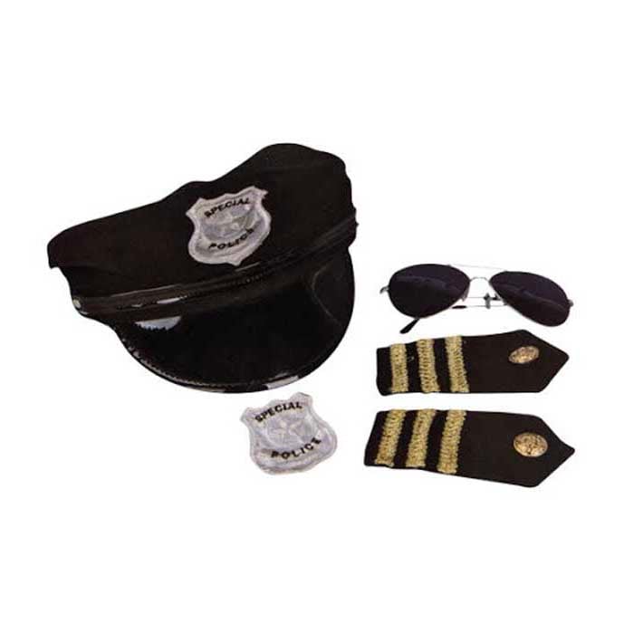 Setet innehåller: hatt (omkrets 58 cm), solglasögon, polisbricka och axelklaffar.