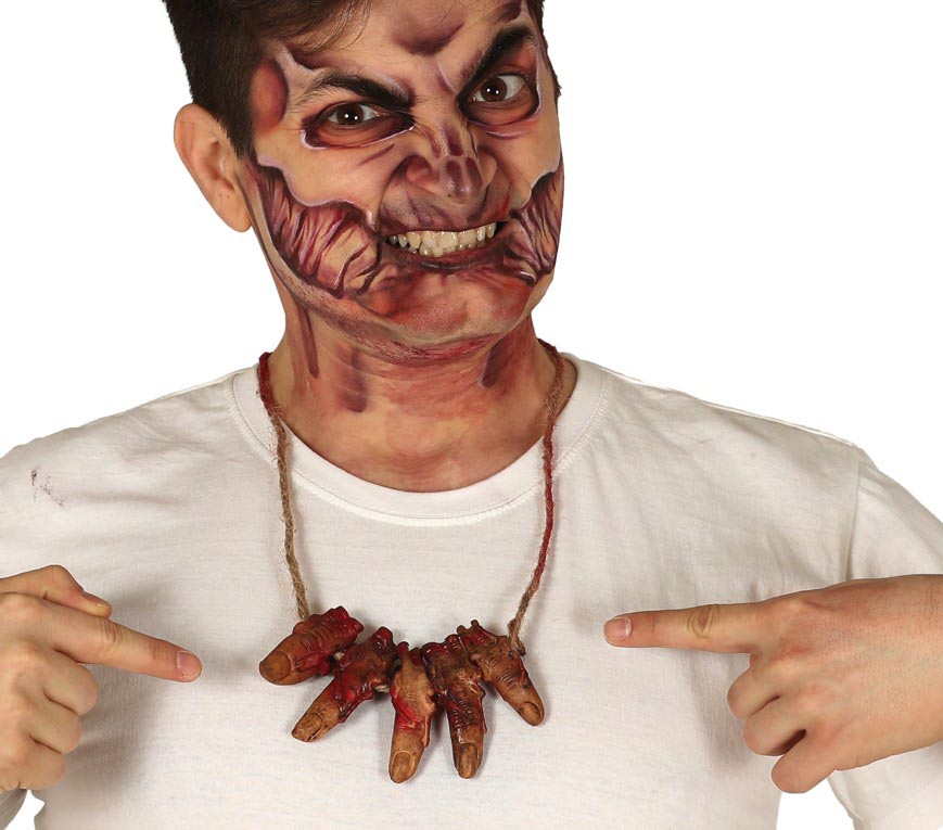 En skrämmande och makaber detalj som lyfter vilken halloweenkostym som helst! Halsbandet består av blodiga, avskurna fingrar som hänger längs snöret och ger en obehagligt realistisk effekt. Perfekt för dig som vill överraska, chocka och roa på halloweenfesten.