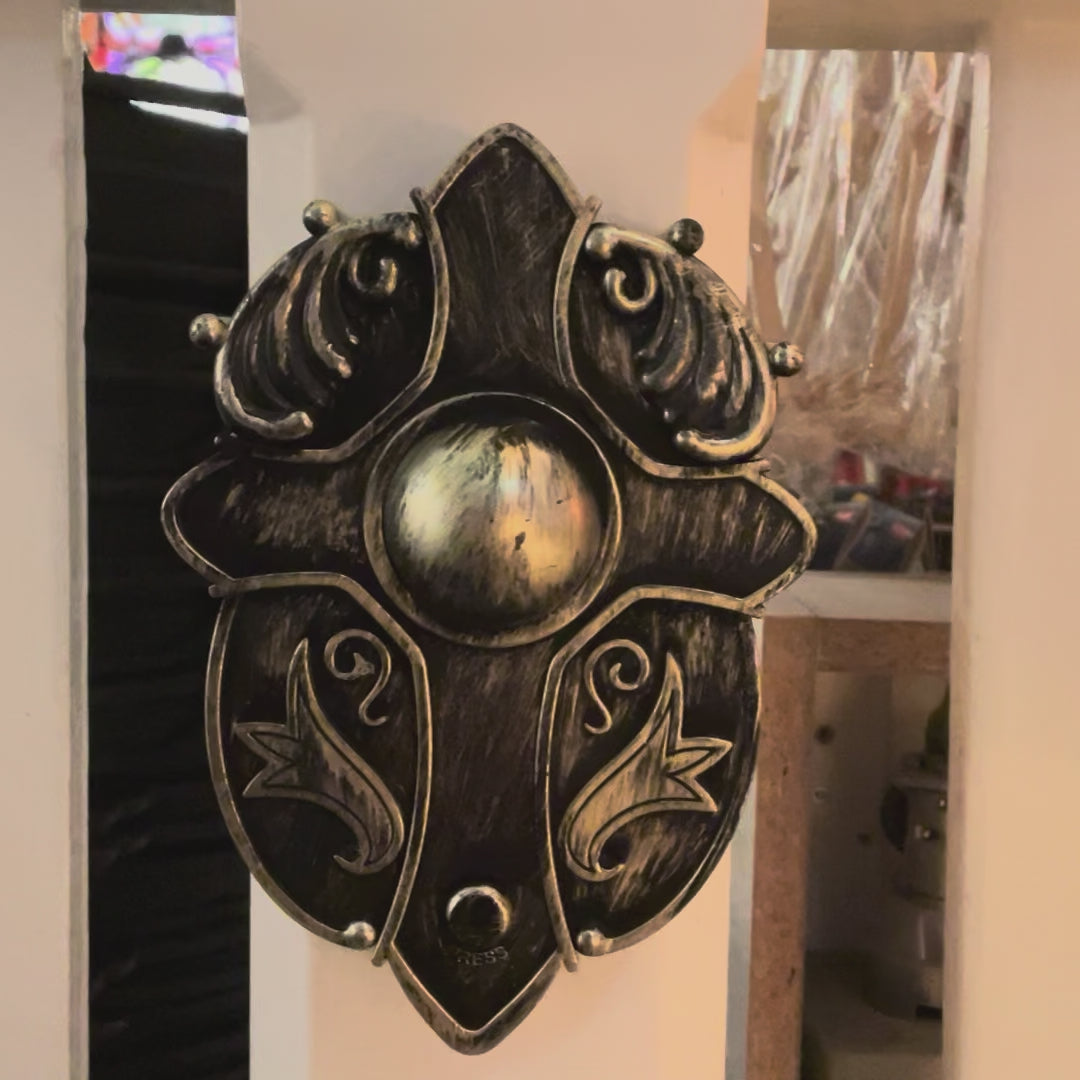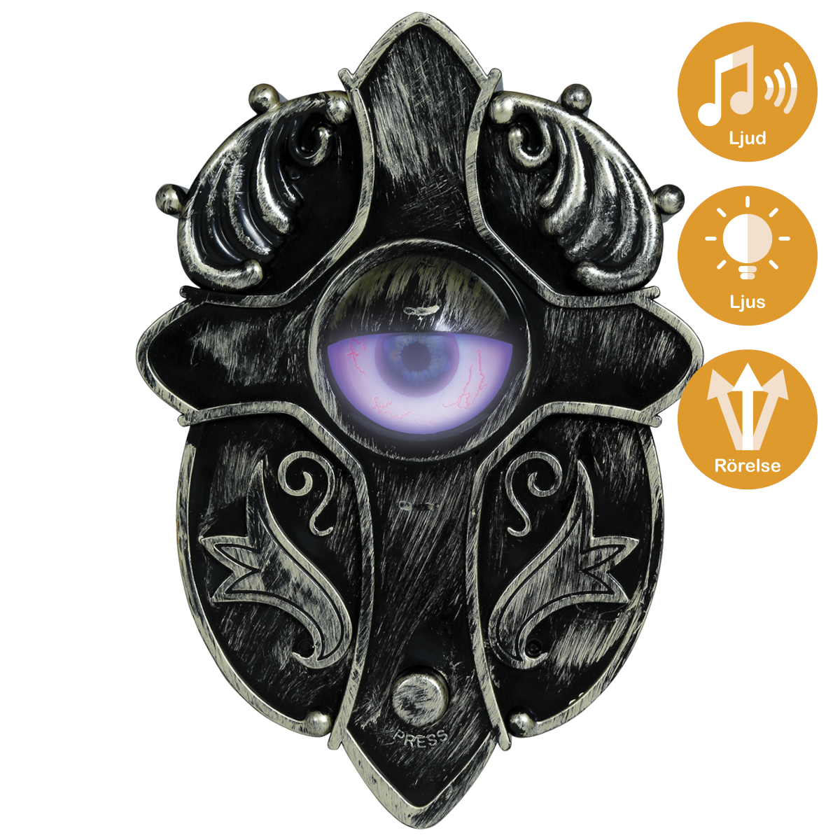 Ett stort blodsprängt öga öppnas plötsligt, lyser upp i ett kusligt sken och börjar prata med spöklika fraser som “Welcome” och “Enter... at your own risk.” Ögat rör sig medan lamporna blinkar och ljudeffekterna spelar. En perfekt detalj för halloweenfester, dekorationer eller för att ge din ytterdörr en riktigt ruggig touch.