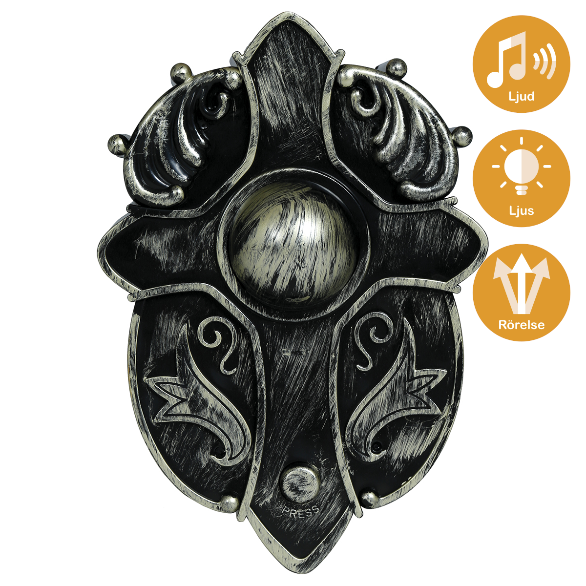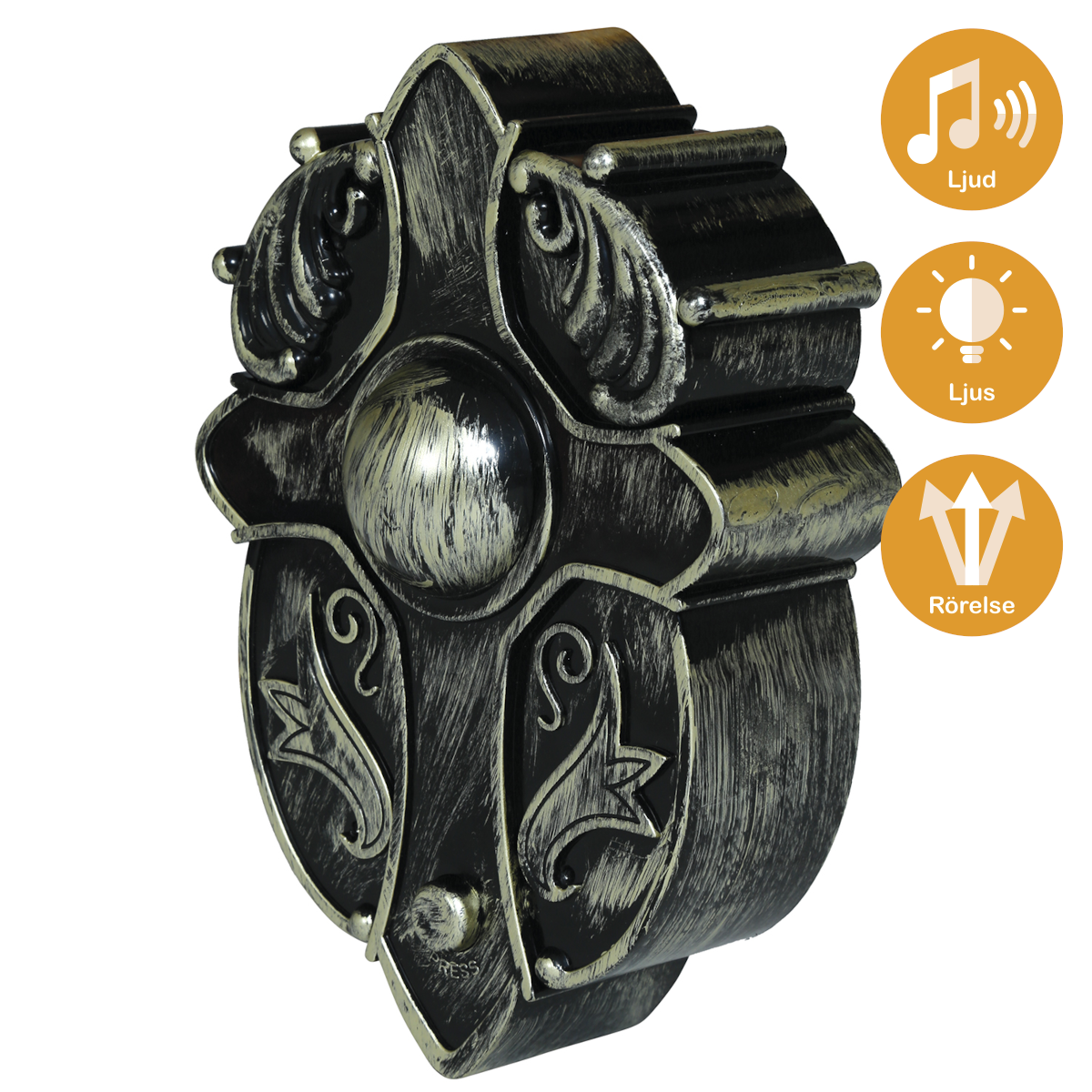 Tillverkad i tålig plast och drivs av 3 AA-batterier, kombinerar denna dörrklocka ljus, ljud och rörelse för att skapa en rolig och skrämmande effekt.