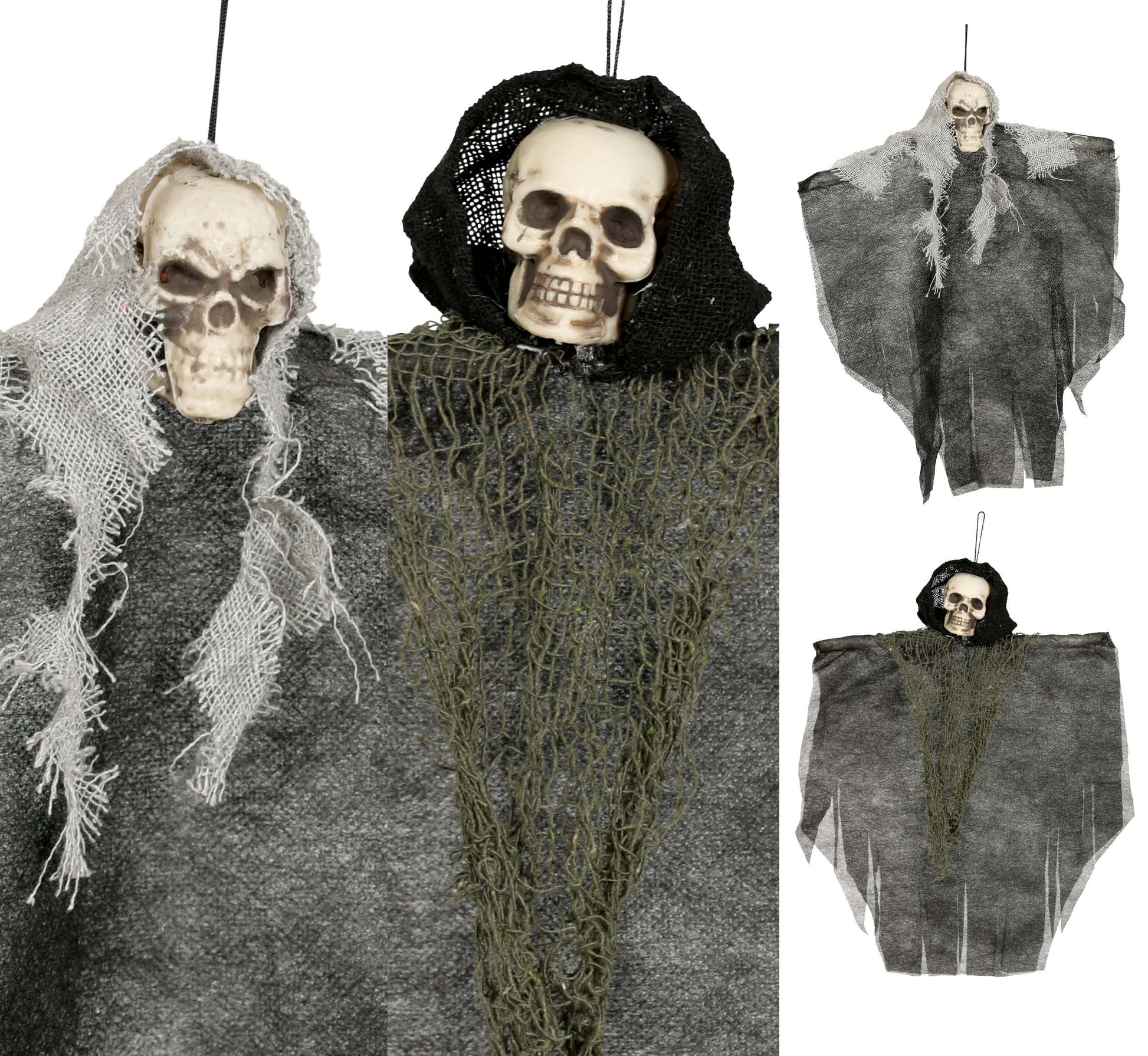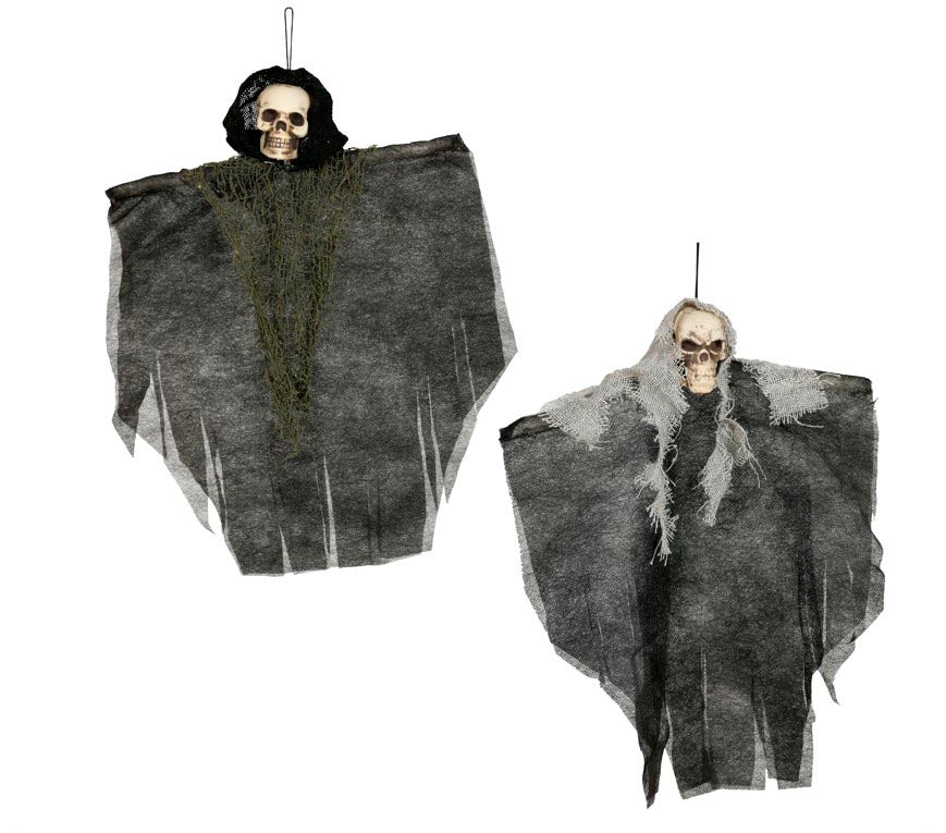 Lägg till en skrämmande detalj i din Halloween-dekoration med denna hängande dödskalle på 30 cm. Dödskallen är klädd i en mörk tunika som förstärker dess spöklika uttryck och gör den till en perfekt dekoration att hänga i taket, vid dörren eller i ett hörn. Den kompakta storleken gör den lättplacerad men tillräckligt iögonfallande för att ge gästerna kalla kårar. En enkel och effektfull prop som passar lika bra till Halloweenfesten som till spökvandringen.