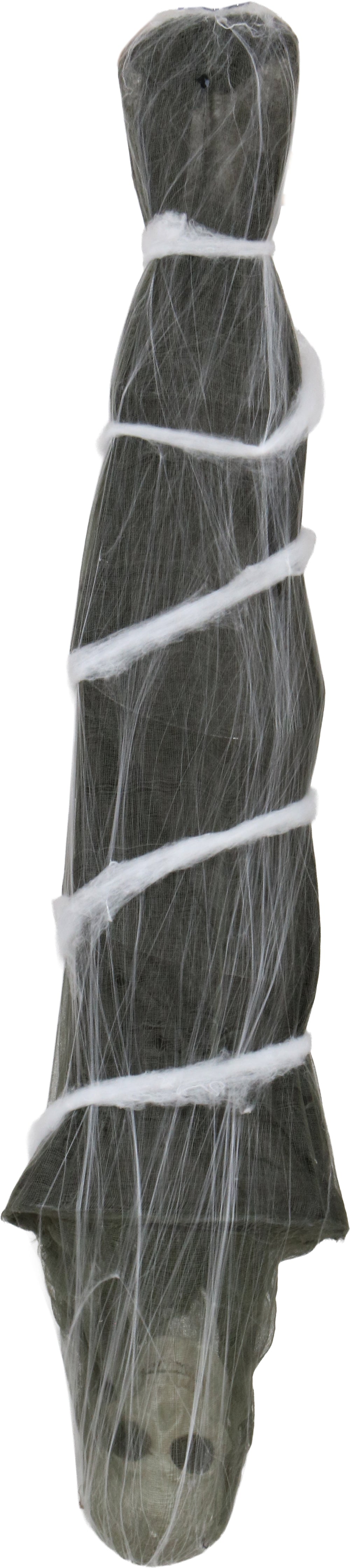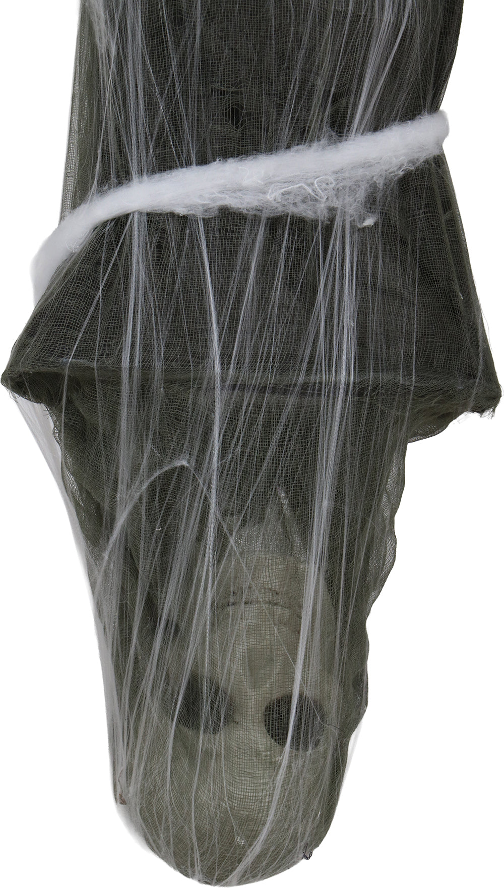 En unik och skrämmande halloweenprop! Denna hängande mumie är 75 cm lång och hänger upp och ner för en extra kuslig effekt. Med sina insvepta, slitna band och ett detaljerat skelettansikte blir den ett perfekt inslag i halloweenmiljön. Placera den i taket, vid entrén eller i ett mörkt hörn för att chocka och överraska gästerna.
