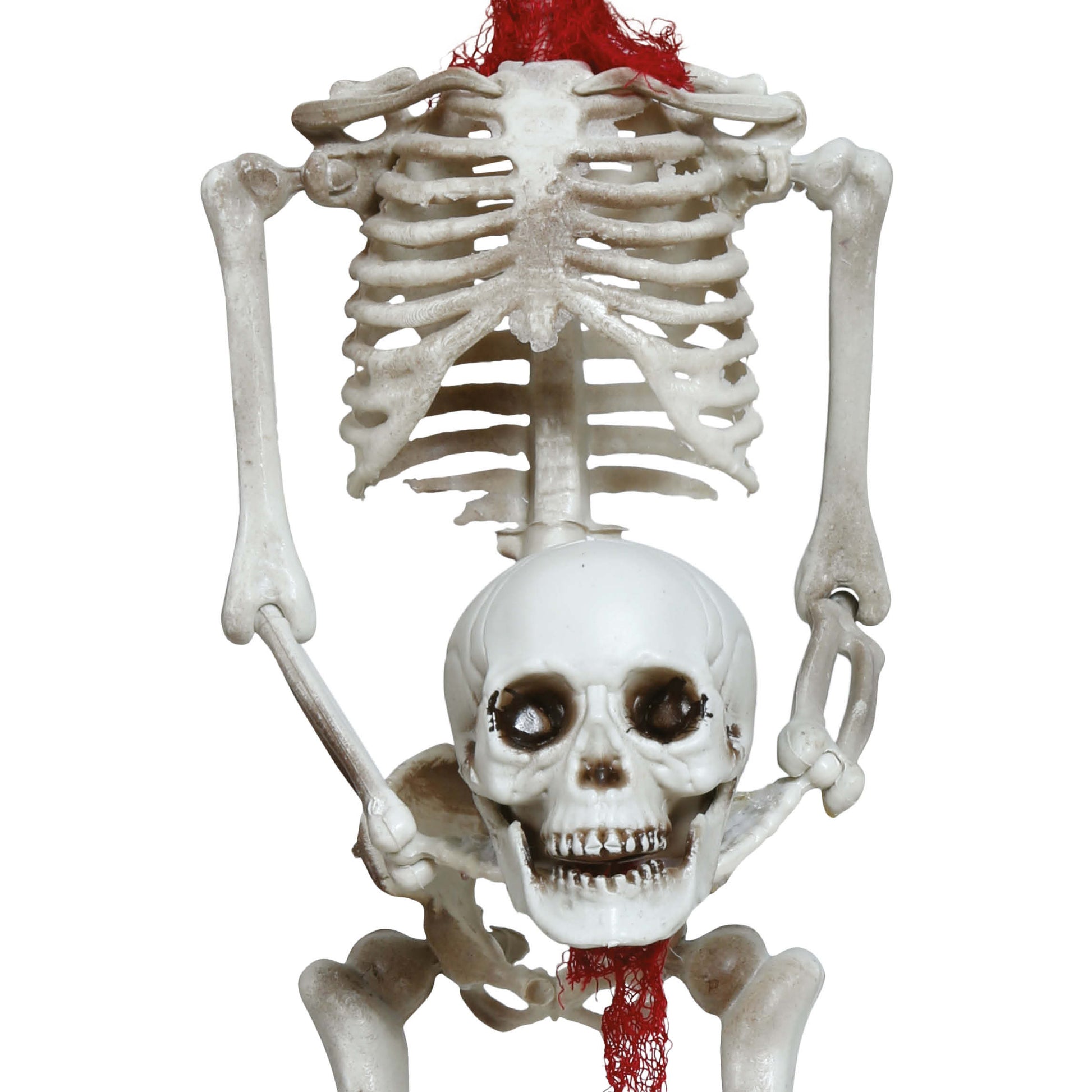 En skrämmande och originell halloweenprop! Detta hängande skelett håller sitt eget huvud i händerna, vilket skapar en makaber och obehaglig effekt. Perfekt att hänga vid entrén, i taket eller i ett mörkt hörn för att chocka och överraska gästerna på halloweenfesten.