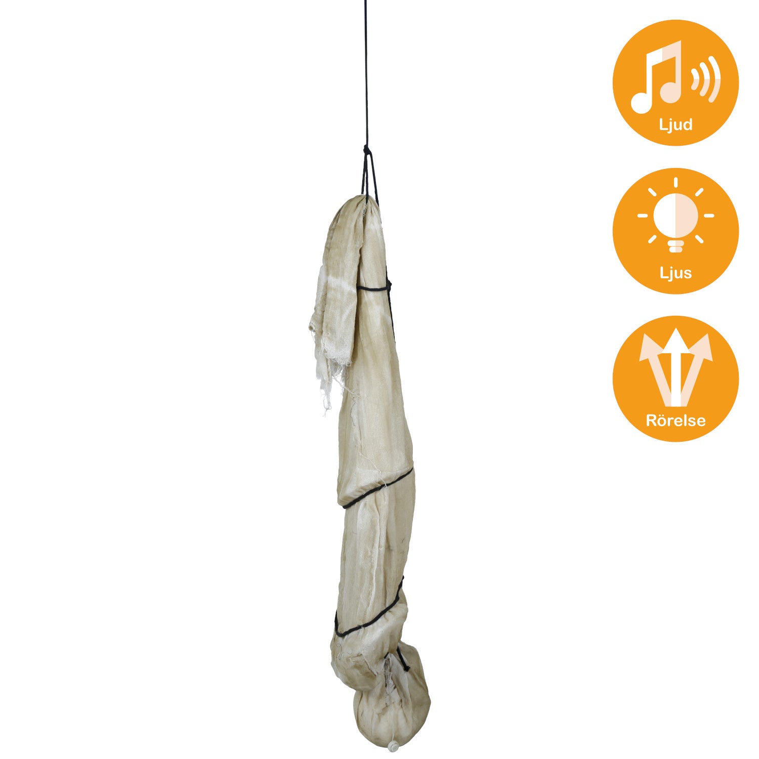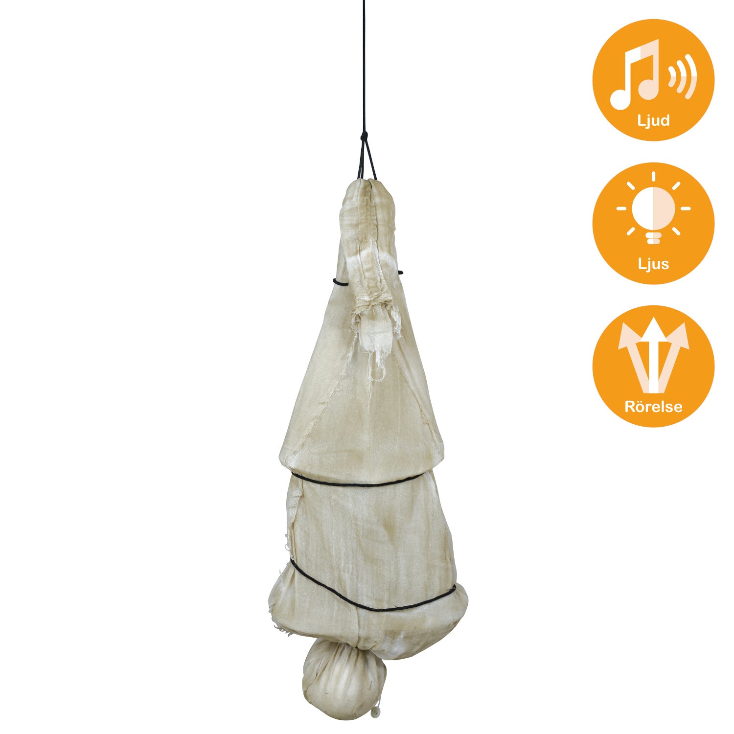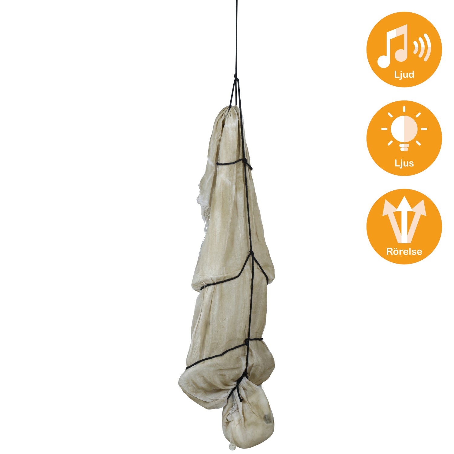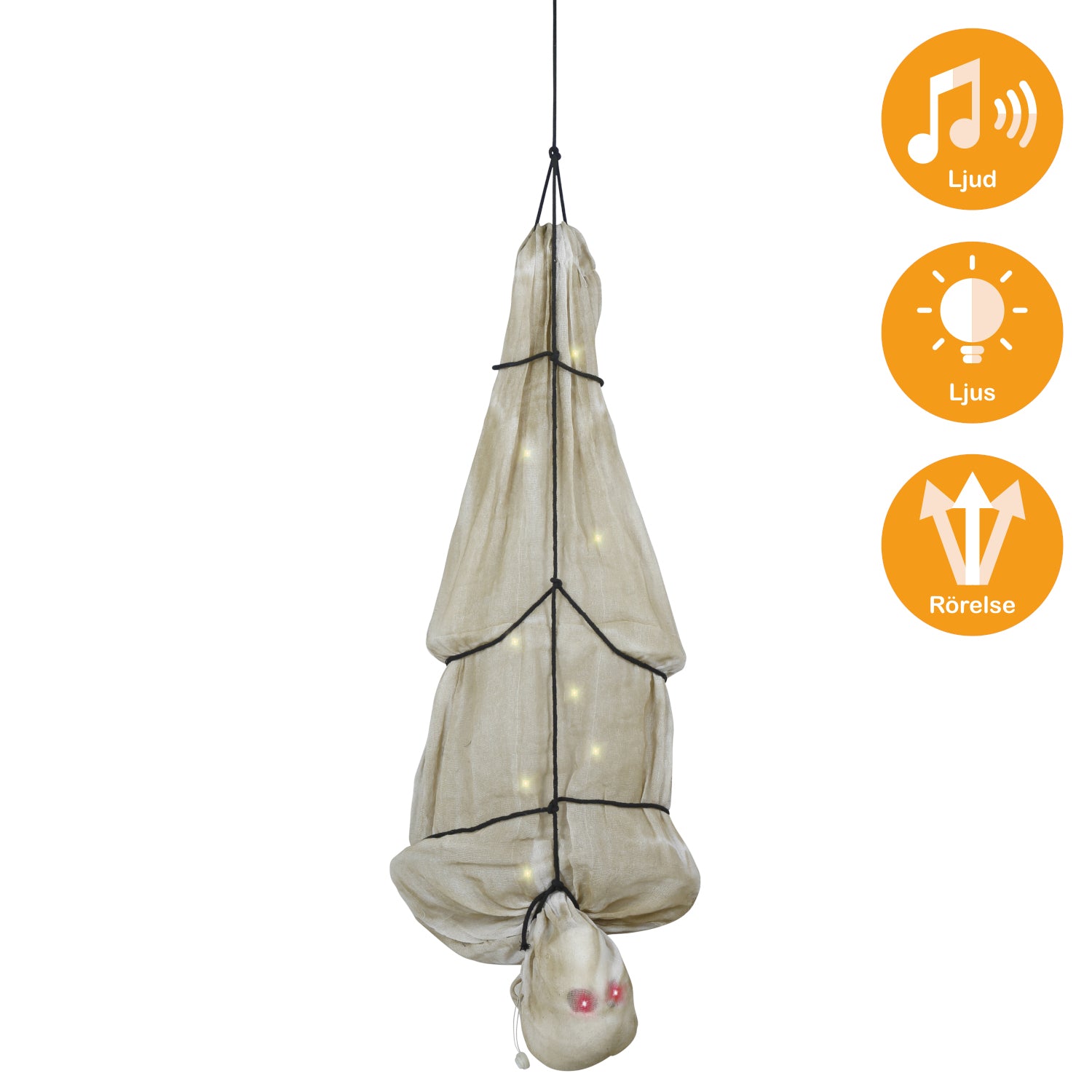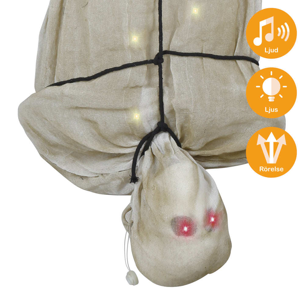 En riktigt kuslig halloweenprop som både syns och hörs! Detta hängande skelett är insvept i en beige säck med svarta band som ger en fängslad och olycksbådande look. Med inbyggda ljuseffekter och skrämmande ljud blir den extra effektfull i mörkret och garanterat en höjdpunkt bland dekorationerna. Perfekt att hänga i taket, vid entrén eller i trädgården för att överraska gästerna.