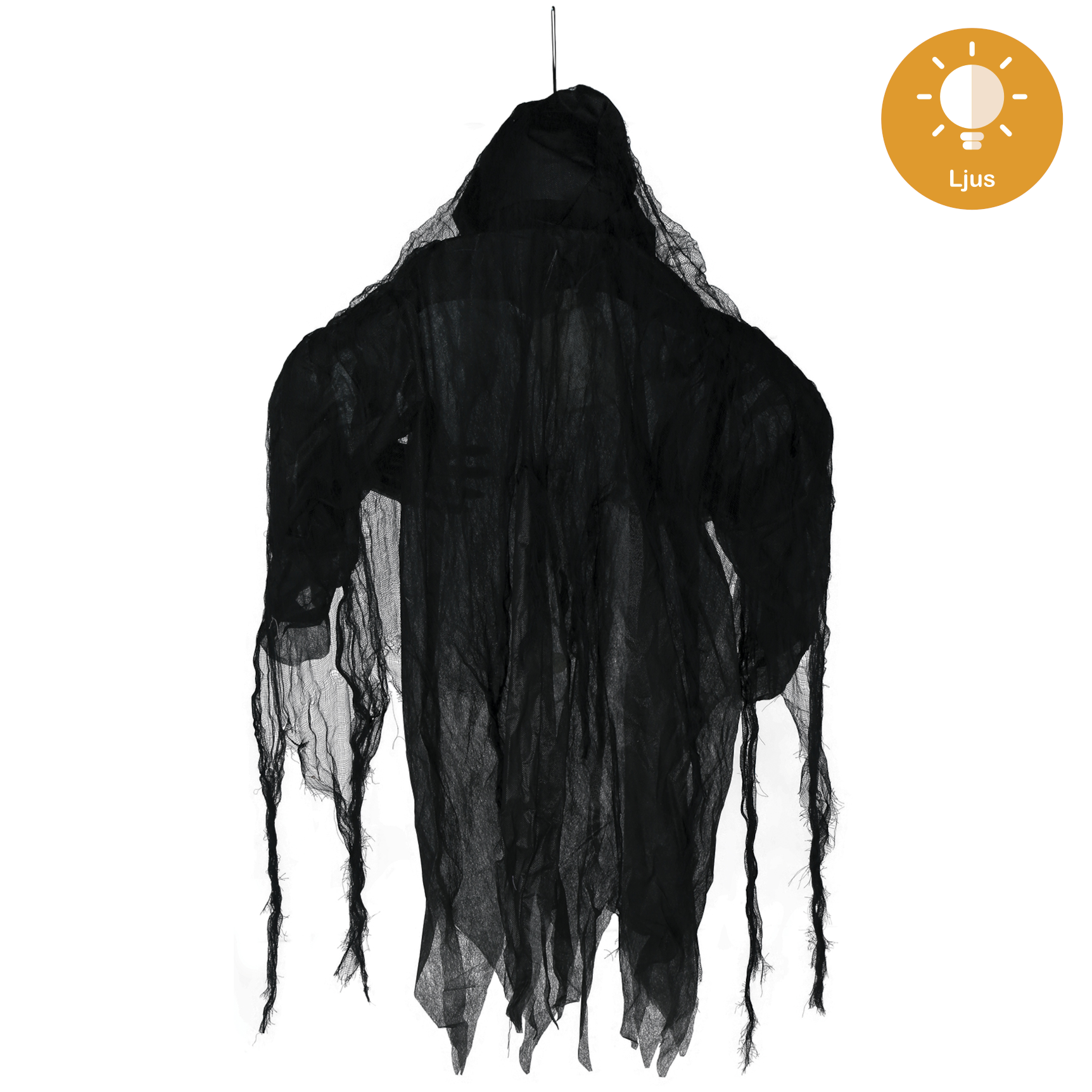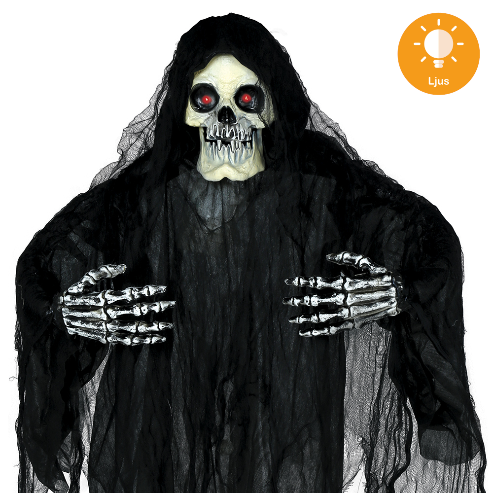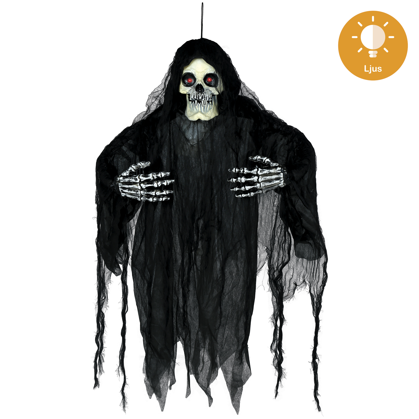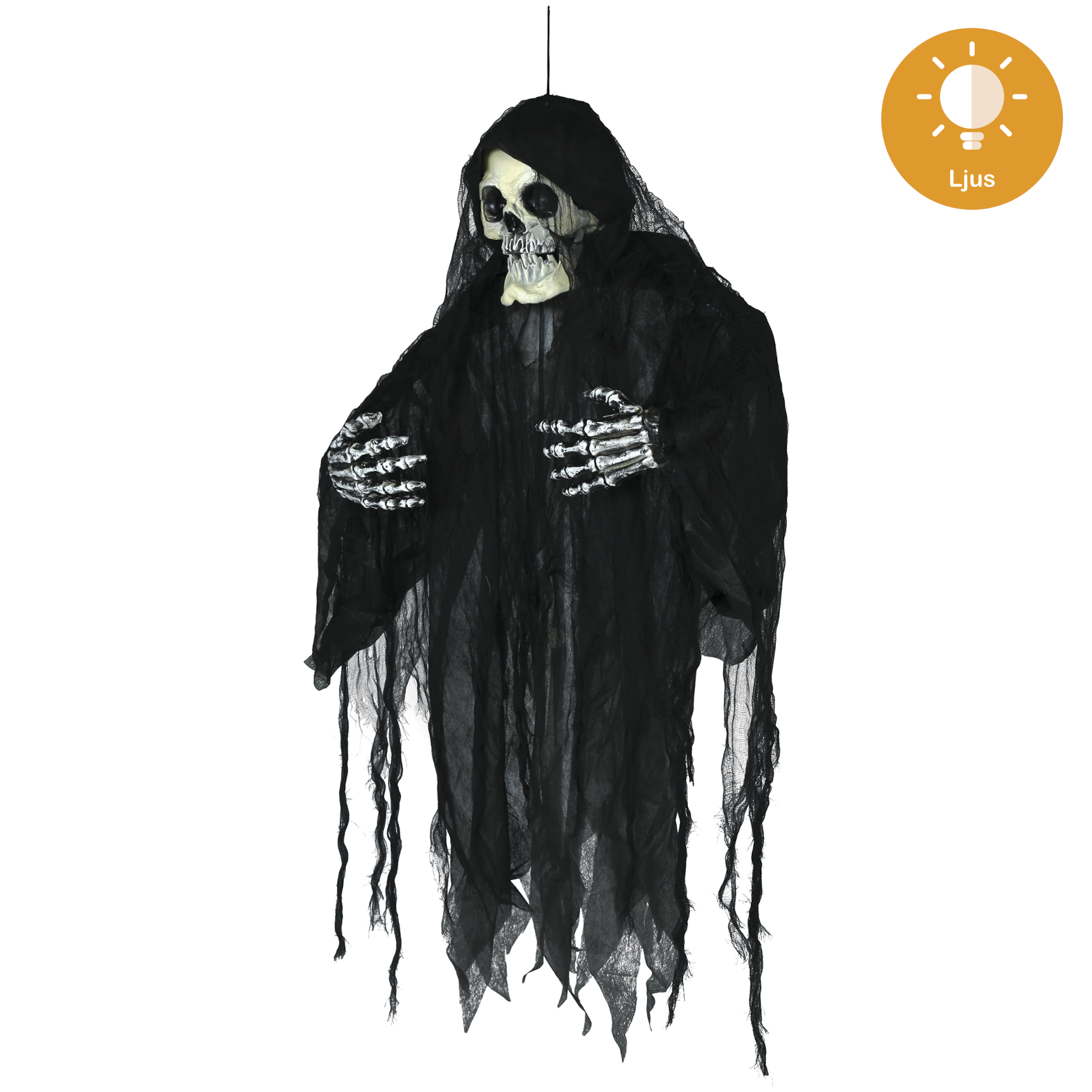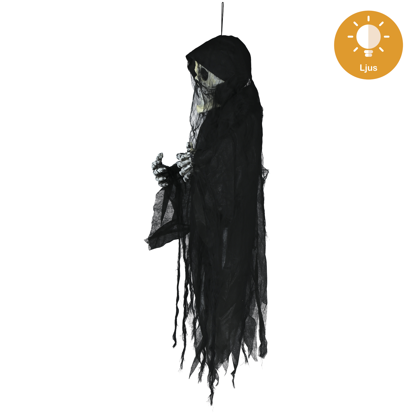 Skapa en ryslig stämning med detta hängande skelett! Figuren är 120 cm lång, har en trasig svart tunika och inbyggd ljuseffekt som gör den extra kuslig i mörkret. Detaljerade skelettdrag och fladdrande tyg gör den perfekt att placera vid entrén, i taket eller i ett mörkt hörn för att överraska gästerna.