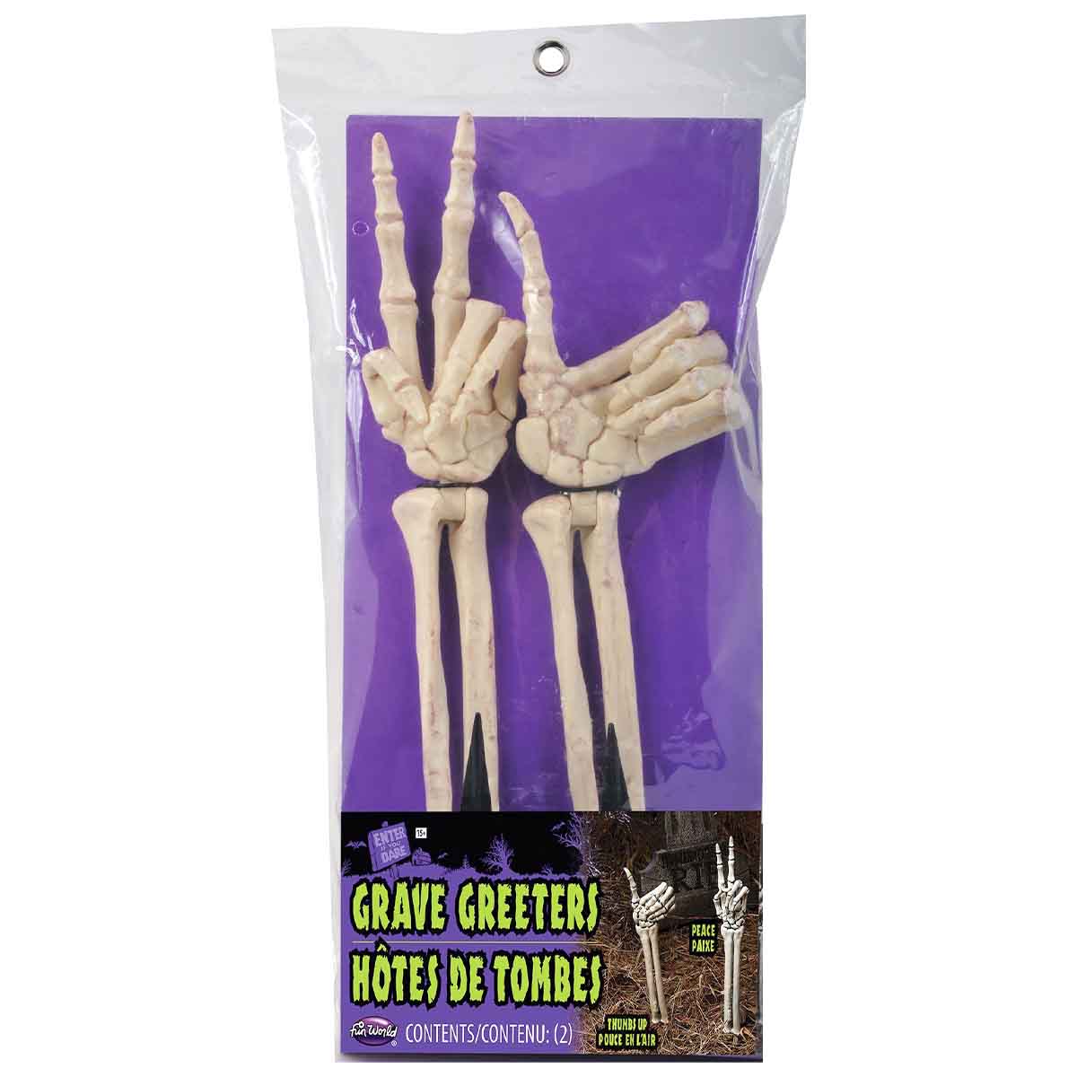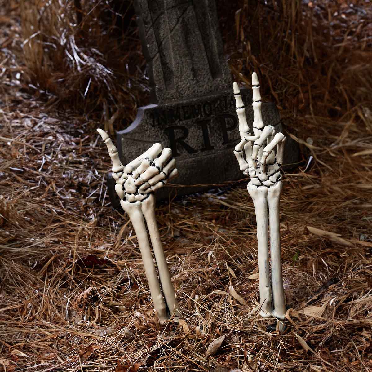 Ge din trädgård en kuslig touch med dessa skelettarmar! Perfekta för att skapa en ryslig kyrkogårdskänsla till halloween eller andra spökiga evenemang. Dessa två skelettarmar, som mäter cirka 35-40 cm (exklusive jordfäste), ser ut som om de gräver sig upp ur marken och hälsar förbipasserande med tecken som "tummen upp" och "peace". Den realistiska benstrukturen gör dem både skrämmande och roliga, vilket ger din trädgårdsdekoration en humoristisk twist samtidigt som de bidrar till en riktig spökstämning. De är lätta att montera tack vare de medföljande jordfästena, vilket gör det enkelt att placera dem var du vill!