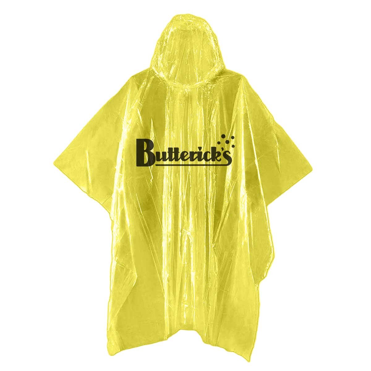 Gul regnponcho med svart Butterick's logga fram och bak.