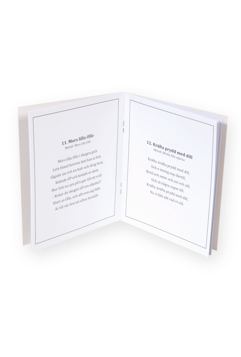 Det finns inget som höjer stämningen på en tillställning som att få ta ton tillsammans med sina vänner runt bordet. Med detta praktiska sånghäfte behöver ni inte förereda några spellistor. Här finns alla sånger som tillhör en kräftskiva av rang. Fyll glaset, ta ton och sjung för full hals!