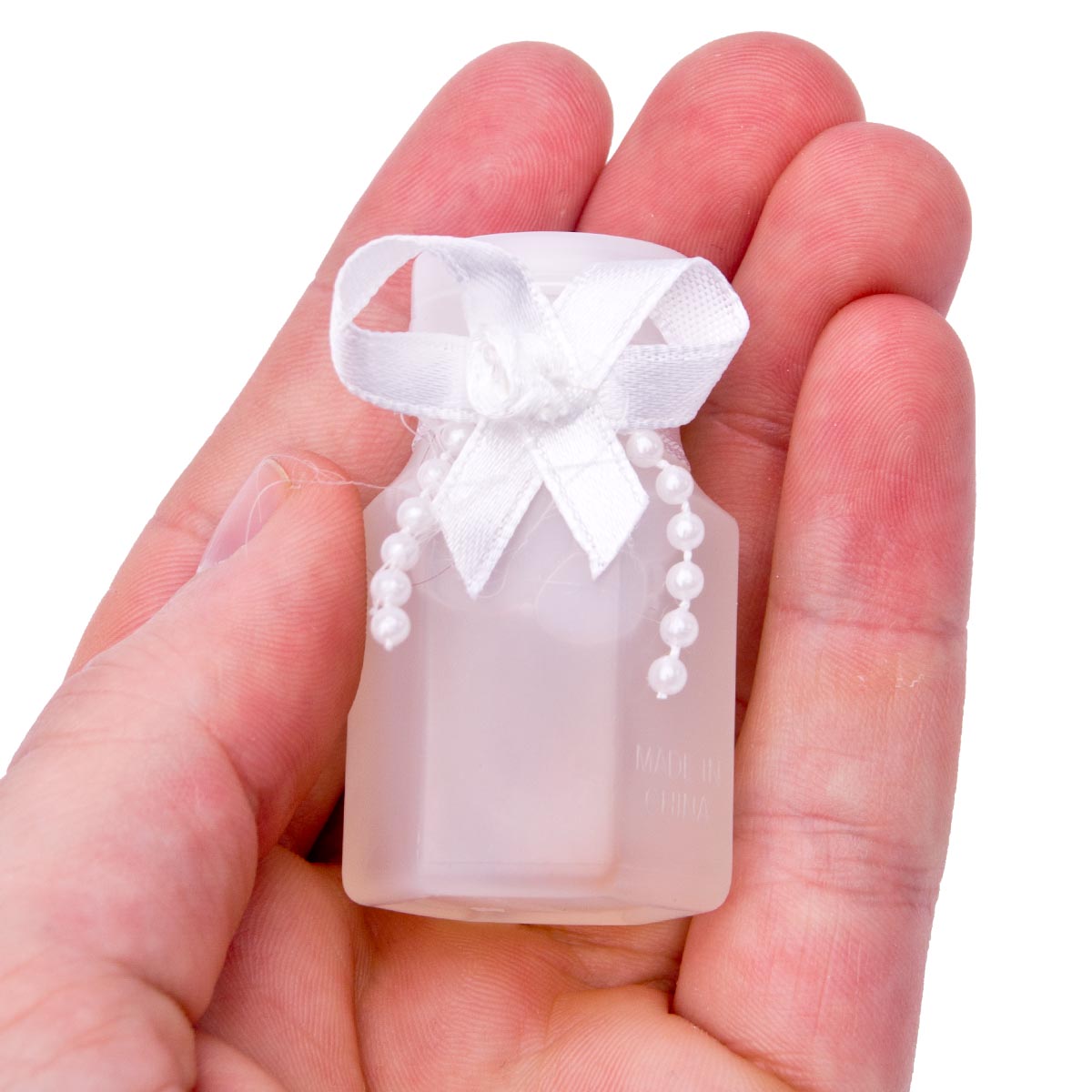 Låt kärleken sväva i luften med dessa förtrollande såpbubblor! Denna lilla, fina förpackning med såpbubblor är dekorerad med en söt vit rosett och eleganta detaljer, vilket gör den till en perfekt för bröllop. Låt gästerna blåsa bubblor när brudparet lämnar kyrkan, som ett modernt och festligt alternativ till traditionellt risskuren. Inte bara skapar bubblorna en magisk atmosfär, de blir också en fantastisk bakgrund för bröllopsfotografering.