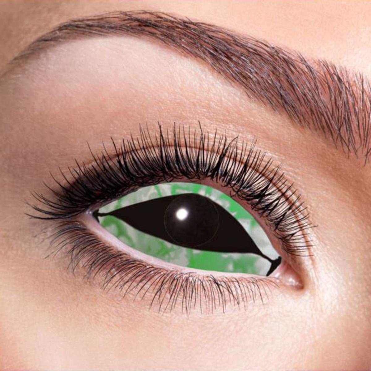 Den här scleralinsen är spräckligt aliengrön med läskiga svarta pupiller som får dig att komma från en annan värld, Vi vet alla att aliens går omkring bland oss året om men med denna i ögonen kommer de alla tro att du är en av dem. En läskig lins att bära till halloween eller under temafesterna under året med rymden tema.
