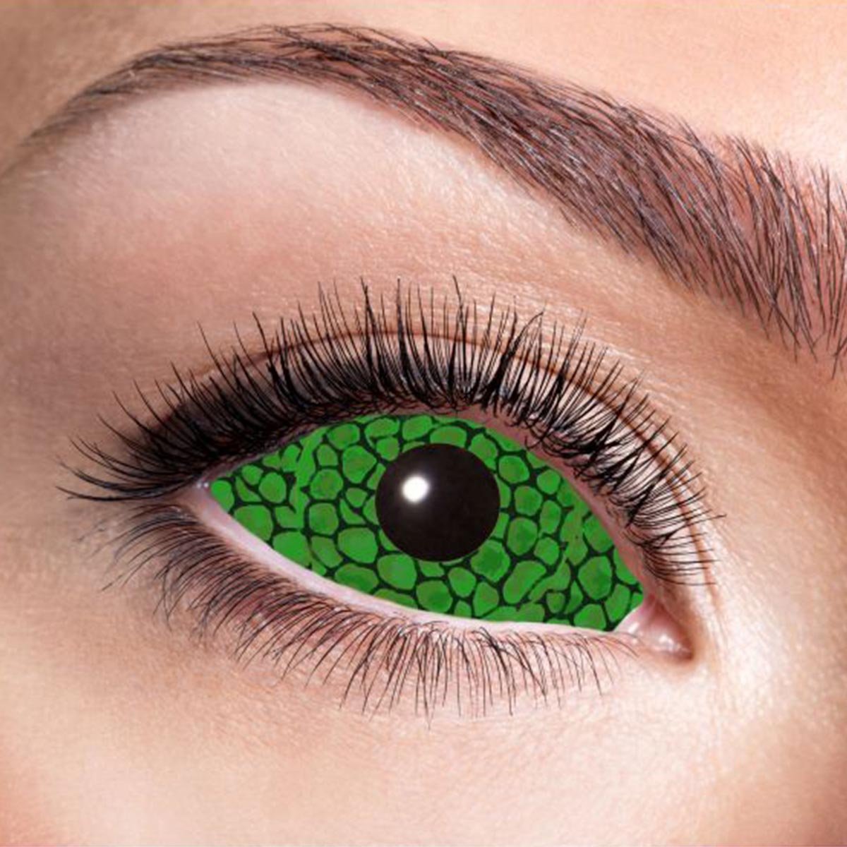 Den här scleralinsen har spräckligt ormskinn mönster i grönt och svart som täcker din ögonvita och hål till din pupill i mitten som gör att du skapar en orm känsla på dina ögon. En effektiv lins som skapar wow-känsla när du bär den och du kan komplettera linsen med maskeradkläder eller en halloween sminkning.