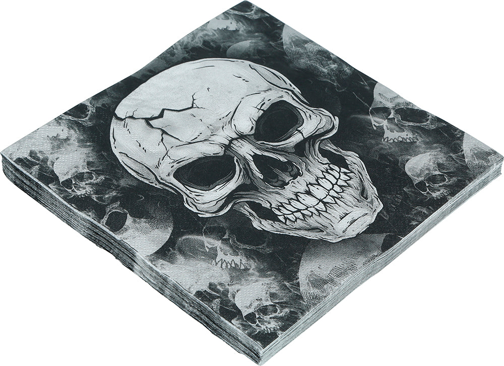 Ge din dukning en kuslig och dramatisk känsla med dessa servetter prydda av dödskallemotiv. Perfekta för Halloween, temafester eller skräckkvällar där du vill skapa en mörk och stämningsfull atmosfär. Servetterna är tillverkade i mjukt, absorberande papper av hög kvalitet och fungerar både som praktiskt hjälpmedel vid servering och som en dekorativ detalj på bordet. Kombinera gärna med matchande muggar, tallrikar och andra dekorationer för en helhet som verkligen imponerar på gästerna.