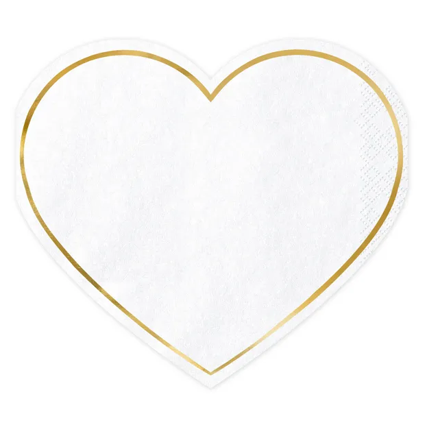 Eleganta servetter i form av hjärtan med stilren vit färg och dekorativ vitguldkant. Perfekta för bröllop, dop, babyshower, Alla hjärtans dag eller andra festliga tillfällen där du vill skapa en romantisk och lyxig dukning.