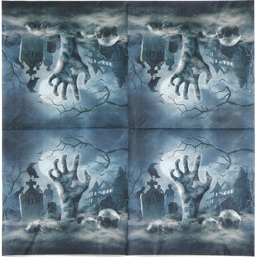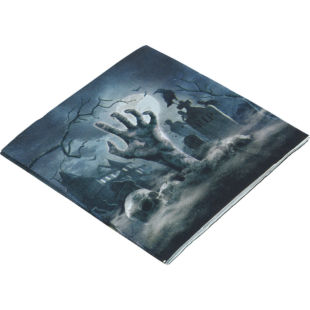 Ge dukningen en kuslig touch med dessa servetter prydda av ett kyrkogårdsmotiv. Designen med gravstenar, mörka siluetter och spöklika detaljer gör dem till ett perfekt inslag på Halloweenfesten eller skräcktemat. Servetterna är tillverkade i mjukt, absorberande papper av hög kvalitet och fungerar lika bra för att torka upp spill som att komplettera dekorationerna på bordet. Engångsservetterna gör dukningen både festlig och praktisk, och kan enkelt matchas med tallrikar, muggar och andra dekorationer i samma stil för en komplett helhetskänsla