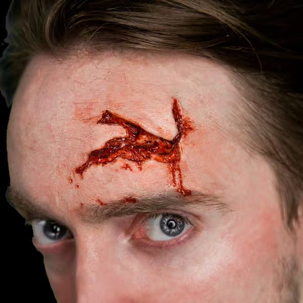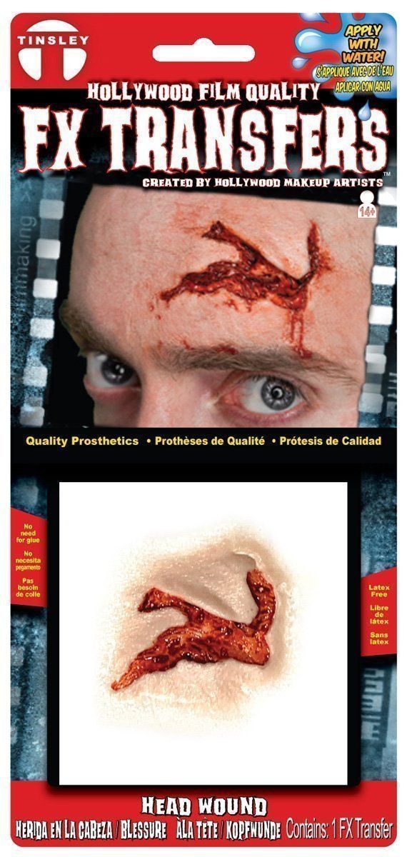 FX Transfers "Head Wound" ger en otroligt realistisk illusion av ett blodigt huvudtrauma – direkt ur en skräckfilm. Perfekt för Halloween, film, teater eller cosplay när du vill skapa en riktigt obehaglig och dramatisk effekt. Appliceringen är enkel och kräver bara vatten, vilket gör den smidig även för nybörjare och helt utan behov av lim eller extra produkter. Protesen har en naturtrogen struktur och färgsättning som gör att den smälter in i huden för ett professionellt resultat. Den är bekväm att bära, hållbar hela kvällen och en garanterad effekt som väcker rysningar.