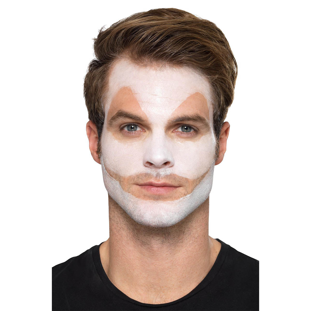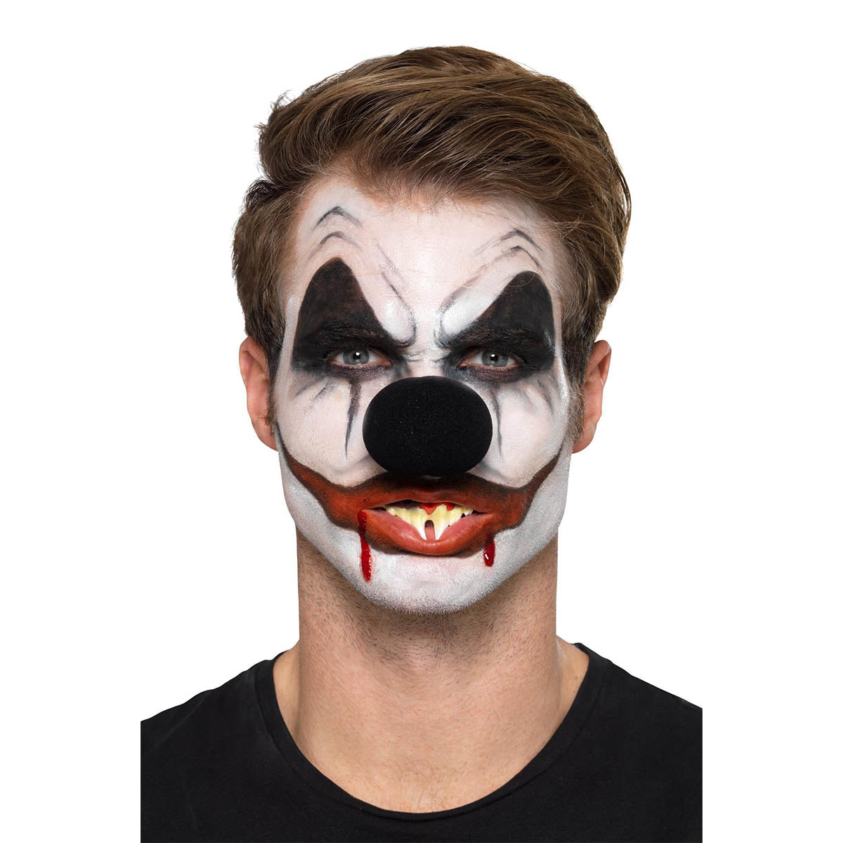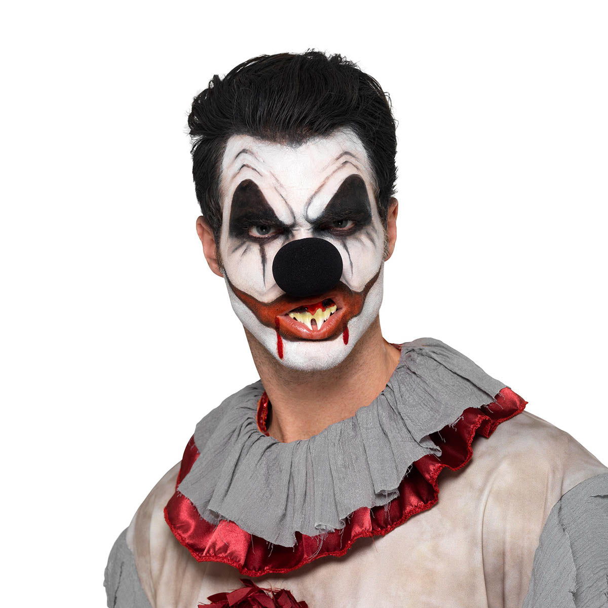 Setet inkluderar en vit bas för att skapa en spöklik hy, svarta och röda färger för att forma dramatiska konturer och detaljer, samt en blodig mun som kompletteras av de medföljande huggtänderna. Den svarta näsan är pricken över i och ger dig den klassiska men ändå skrämmande clownestetiken. Med den medföljande sminkborsten och applikatorn är det enkelt att applicera sminket jämnt och skapa djupa skuggor och kontraster som förstärker din look.
