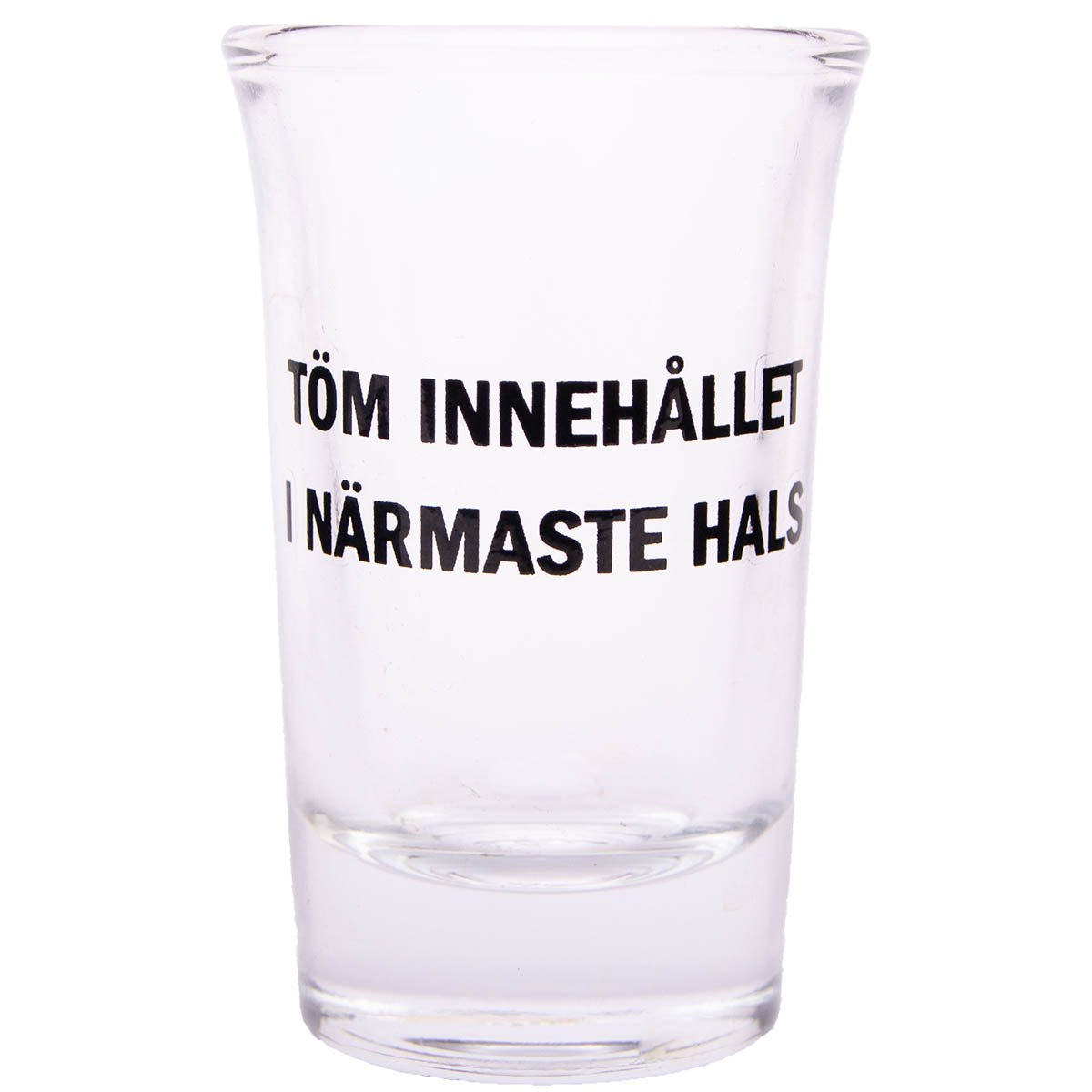 - Snapsglas med texten "Töm innehållet i närmaste hals".