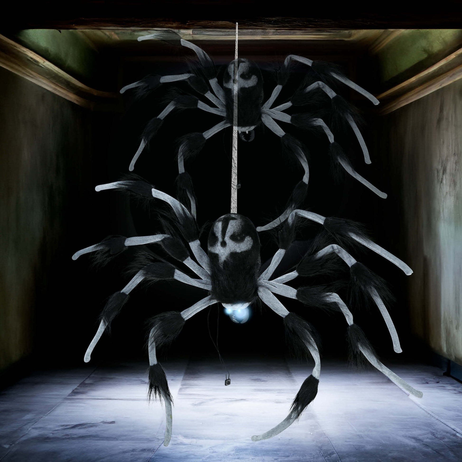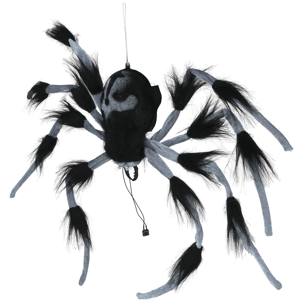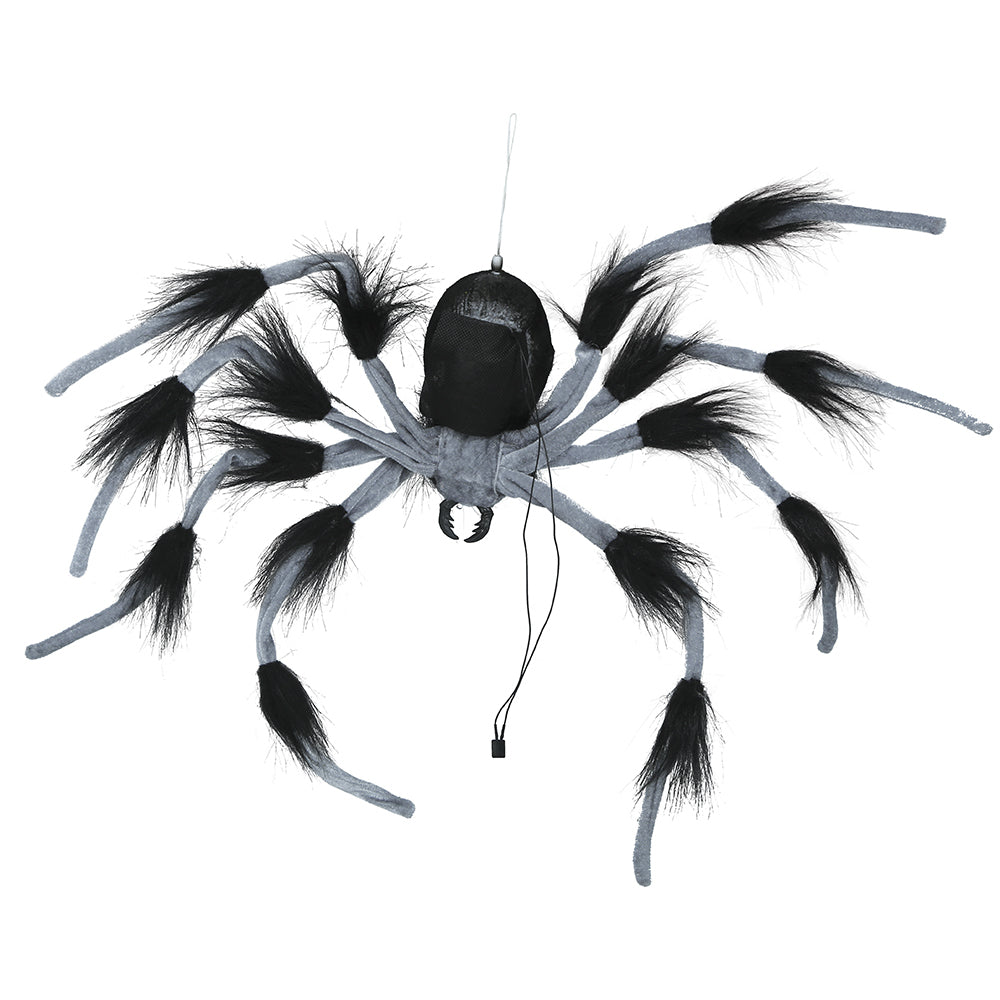 Gör Halloween extra kuslig med denna stora spindel på ca 70 cm som både rör sig och avger ljud. Den håriga designen och de långa benen skapar en realistisk och skräckinjagande look, medan de inbyggda ljudeffekterna och rörelserna får gästerna att hoppa till av skräck. Perfekt att placera i entrén, i ett mörkt hörn eller bland spindelnät för maximal effekt. En dekoration som verkligen tar din Halloween till nästa nivå och garanterar både rysningar och skratt.