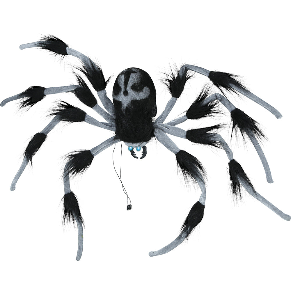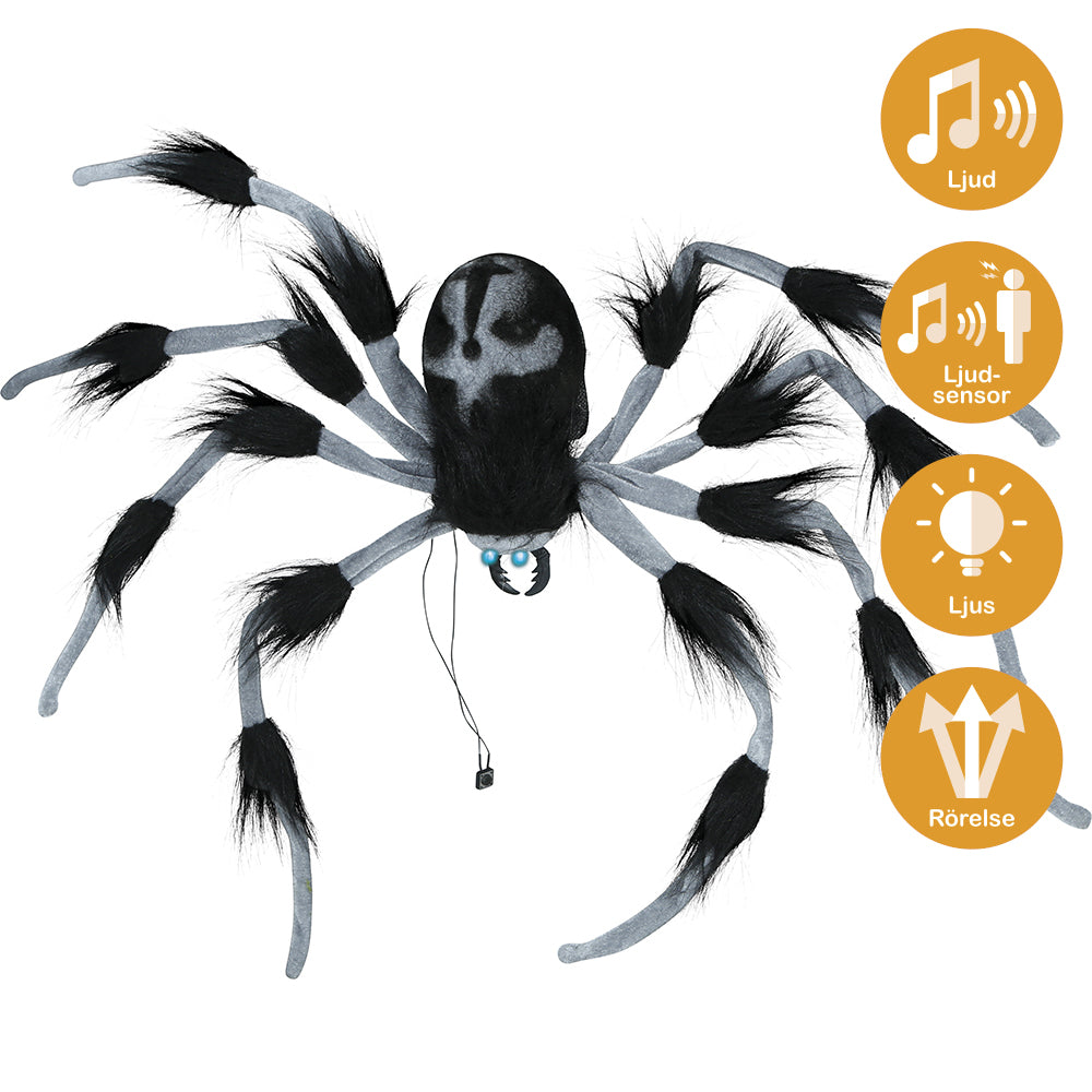 Gör Halloween extra kuslig med denna stora spindel på ca 70 cm som både rör sig och avger ljud. Den håriga designen och de långa benen skapar en realistisk och skräckinjagande look, medan de inbyggda ljudeffekterna och rörelserna får gästerna att hoppa till av skräck. Perfekt att placera i entrén, i ett mörkt hörn eller bland spindelnät för maximal effekt. En dekoration som verkligen tar din Halloween till nästa nivå och garanterar både rysningar och skratt. Batterier ingår.
