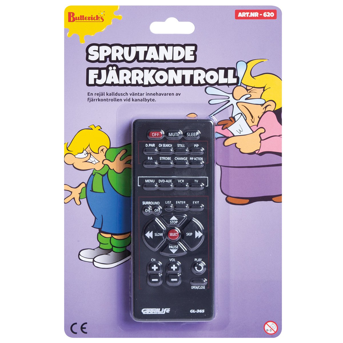 Svart, fjärrkontroll som ser helt äkta ut men som sprutar vatten när man trycker på knapparna.