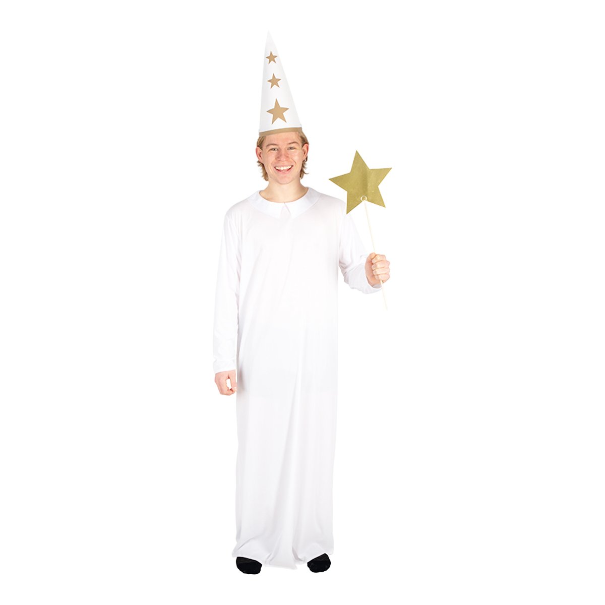 Gör luciatåget komplett med detta klassiska stjärngosselinne i one-size för vuxna! Linnen är tillverkat av mjukt och slitstarkt polyester som ger både komfort och en elegant look. Det vita linnet har en tidlös design med en enkel, platt krage som passar perfekt för stjärngossens traditionella roll i luciafirandet.