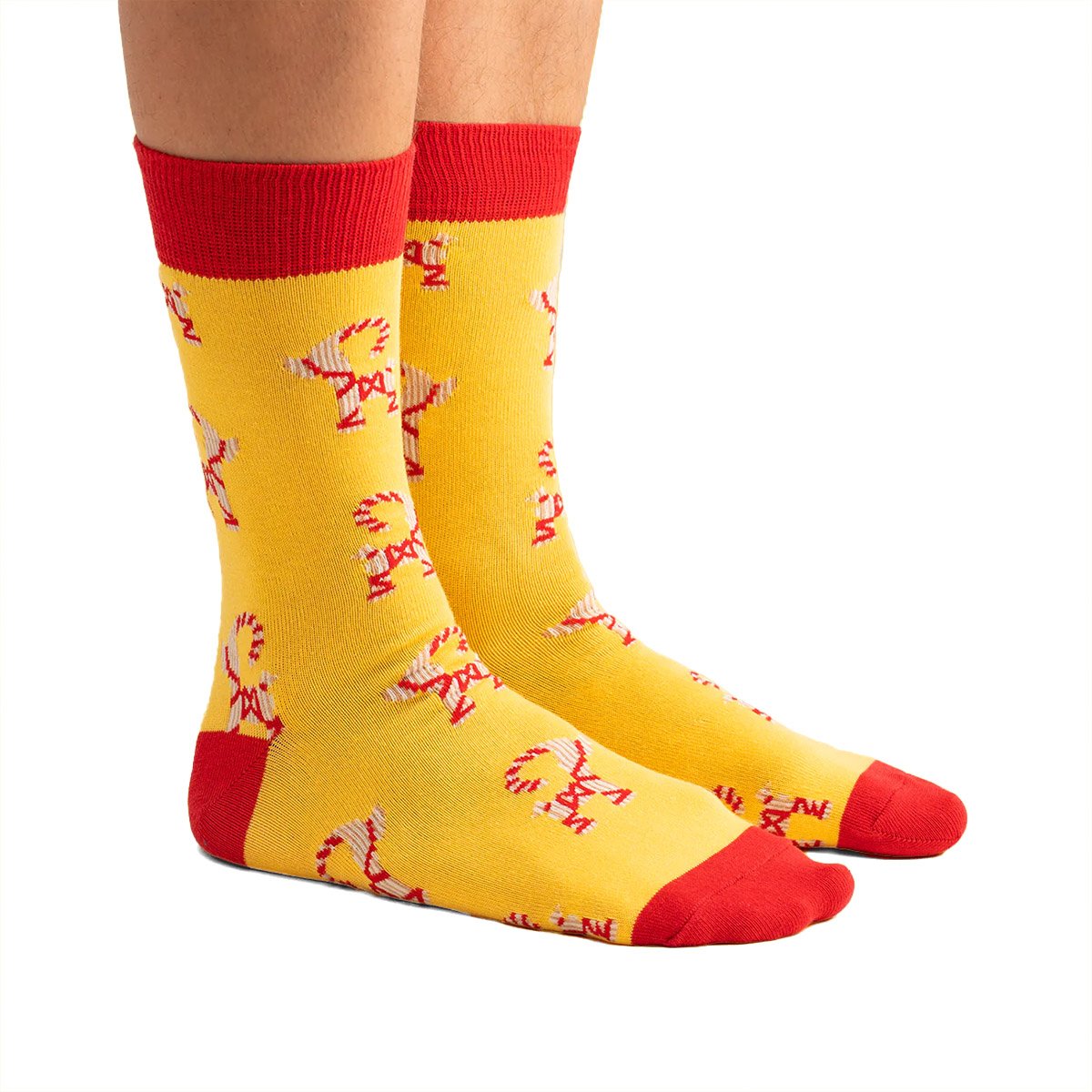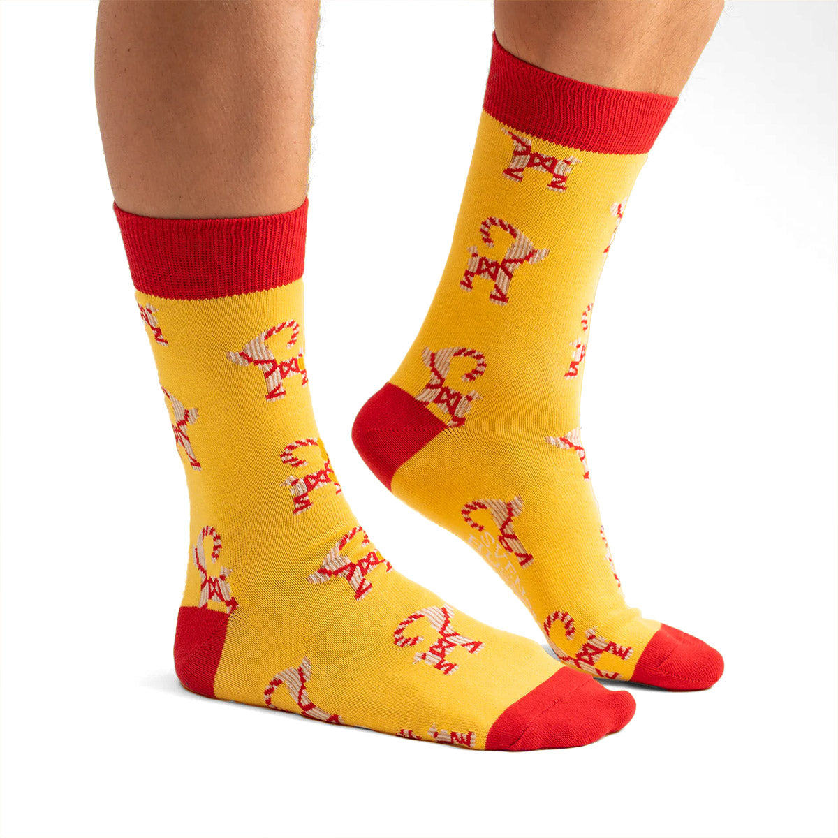 Få en dos svensk jultradition direkt på fötterna med dessa färgglada strumpor med motiv av den klassiska halmbocken! Perfekta att ha på sig hela december för att sprida julstämning från topp till tå. Strumporna har en ljusgul bas med detaljer i rött och visar ett upprepande mönster av halmbockar, vilket ger en både lekfull och traditionell känsla. Tillverkade av Svensk Husman, dessa strumpor kombinerar humor och nostalgi på bästa sätt.