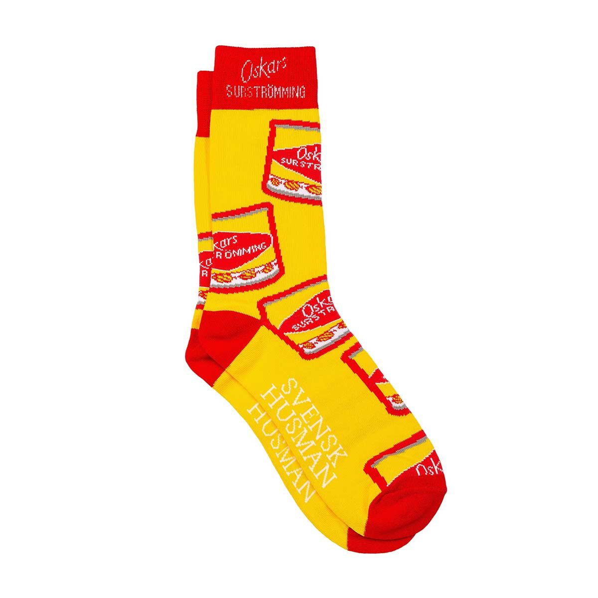 Oskar surströmming, älska den eller hata den. Är du en person som inte kan gå ett år utan att äta god surströmming eller hulkar sig hela kroppen när du tänker på det. Det är strunt samma för dessa oerhört snygga strumporna kan vem som helst bära! Köp dig ett par snyggt sydda gula strumpor med surströmming burkar som motiv.