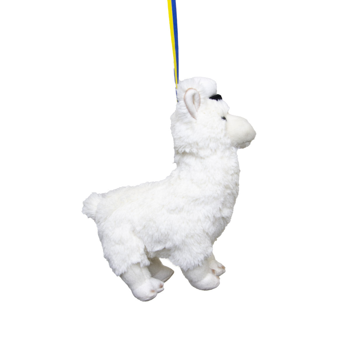 Tillverkad i supermjuk vit plysch, med ett blågult band för att hängas runt halsen, är detta en kramvänlig klassiker.