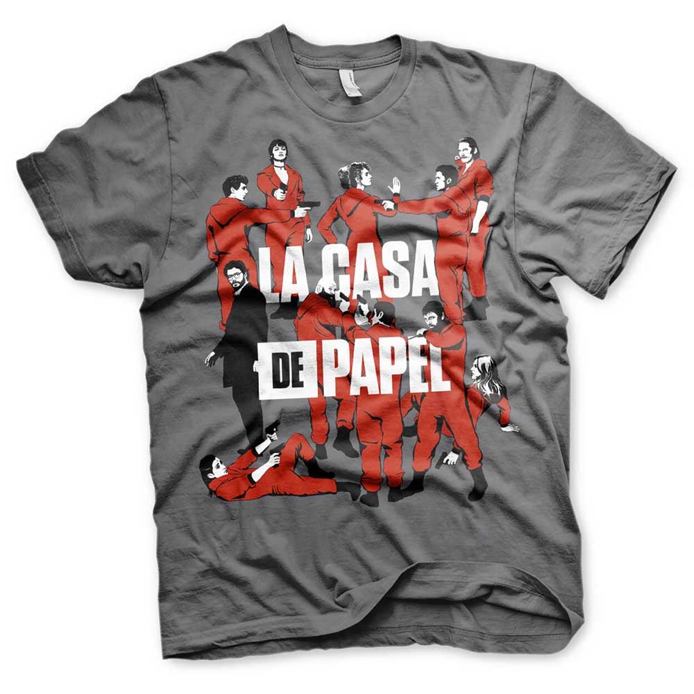 Bella Ciao! Köp en officiell Netflix La Casa de Papel t-shirt! En snygg mörkgrå t-shirt med tryck av flera La Casa de Papel figurer som står och riktar pistoler mot varandra.