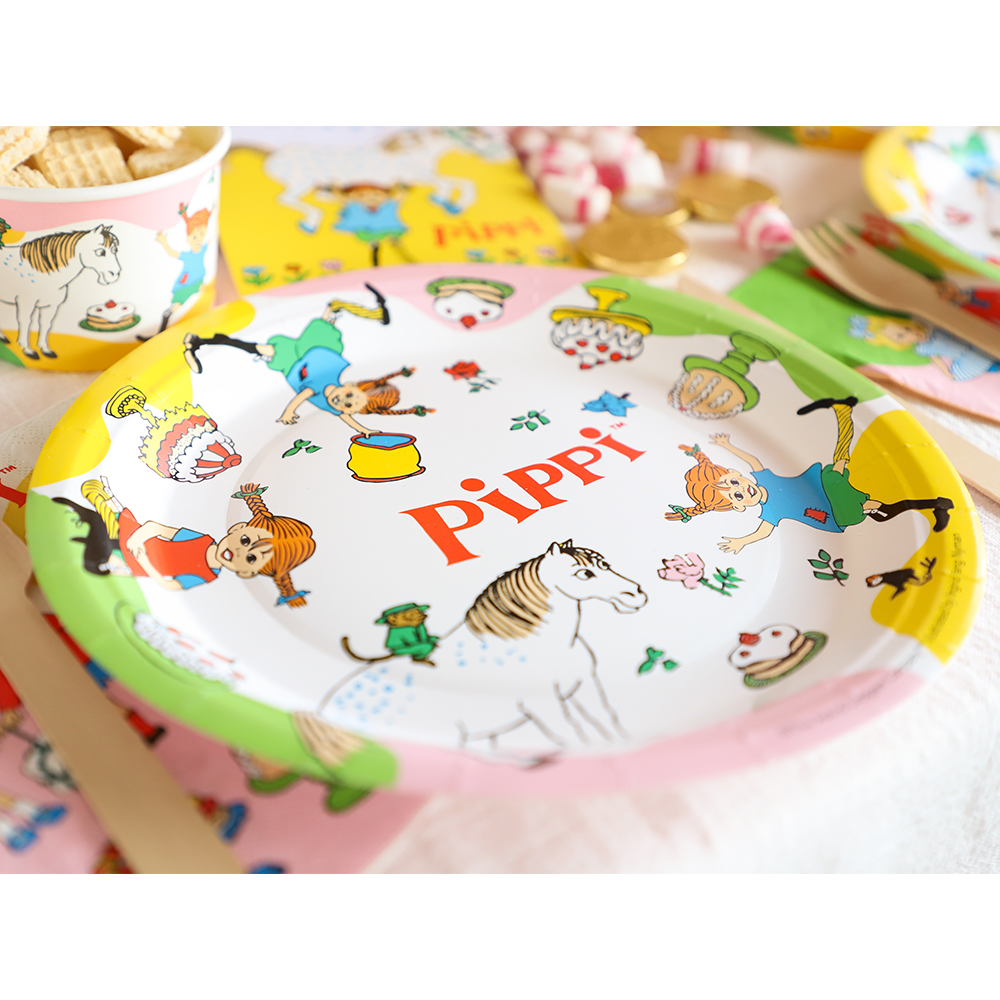 Duka upp till ett riktigt busigt kalas med papperstallrikar med motiv från Pippi Långstrump. De färgstarka illustrationerna skapar en glad och energifylld stämning som passar perfekt till barnkalas och temafester.