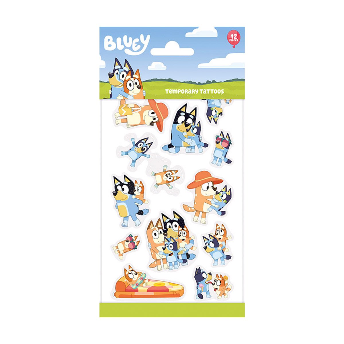 Set med 12 temporära gnuggistatueringar med Bluey och vänner.