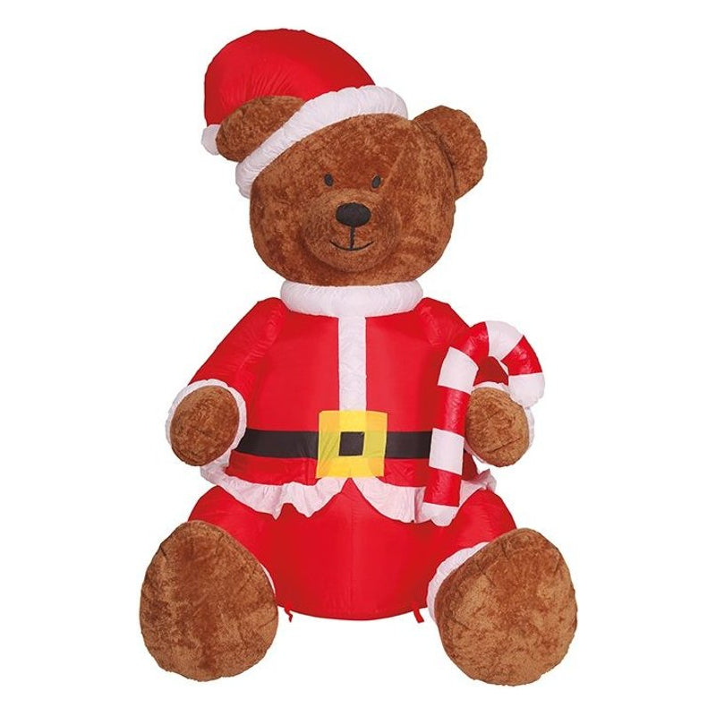 Gör julfirandet extra mysigt med denna uppblåsbara nallebjörn på 180 cm! Den stora och vänliga björnen sitter klädd i en charmig tomtedräkt komplett med bälte, pälsdetaljer och röd tomteluva. I ena tassen håller den en stor polkagriskäpp som ger en lekfull och festlig känsla.