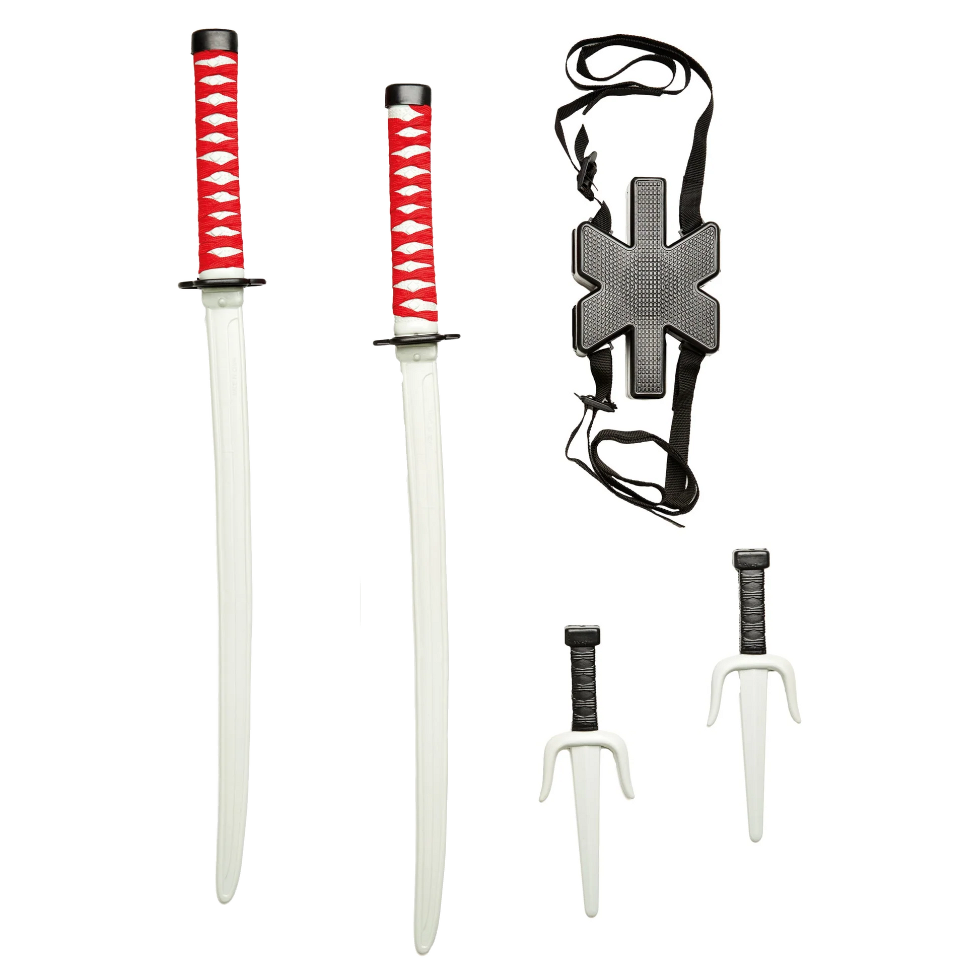 Komplettera din Deadpool-dräkt med det ultimata vapensetet. Denna officiellt licensierade Marvel-accessoar innehåller allt du behöver för att ta din look till nästa nivå, med två ninja-svärd, två sai-knivar och ett pack med hållare så att du kan bära dem på ryggen.