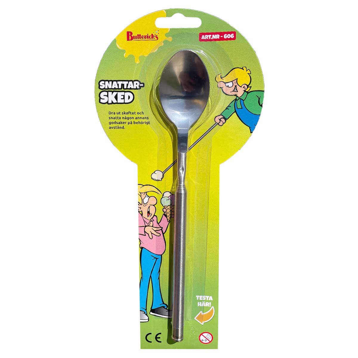 Har din bordsgranne supergod glass eller soppa som du bara måste få smaka på, säg ett snabbt "åh titta där" pekandes och du med lätthet tar fram din snattarsked och kan snabbt ta en sked av vännens goda mat eller tilltugg.