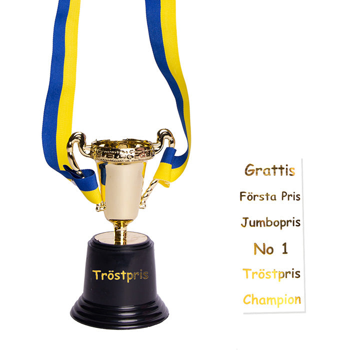 En pokal att hänga runt halsen på den blivande studenten, 5-kampsvinnaren eller någon som bara förtjänar en förstaplats. Pokalen är ca 13 cm hög och hänger i ett blå/gult band. Klisteretiketter medföljer som du kan välja om du vill sätta på pokalen eller inte. Texter som säger grattis, första pris, jumbopris, no 1, tröstpris eller champion.