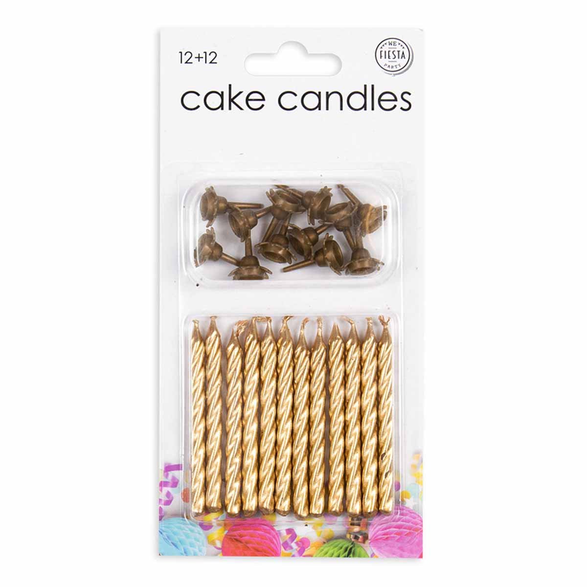 Förpackningen innehåller 12 guldiga tårtljus och 12 ljushållare.