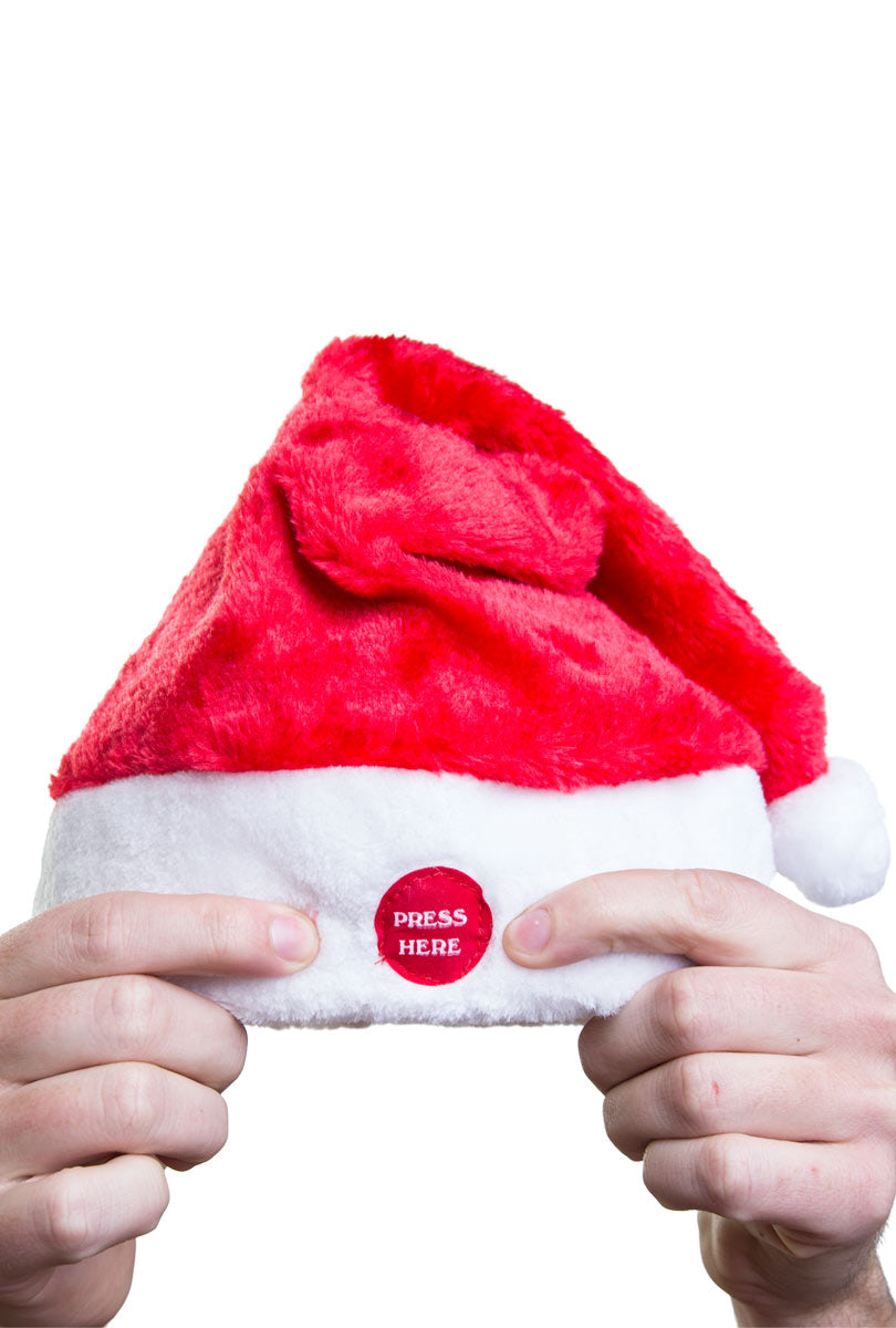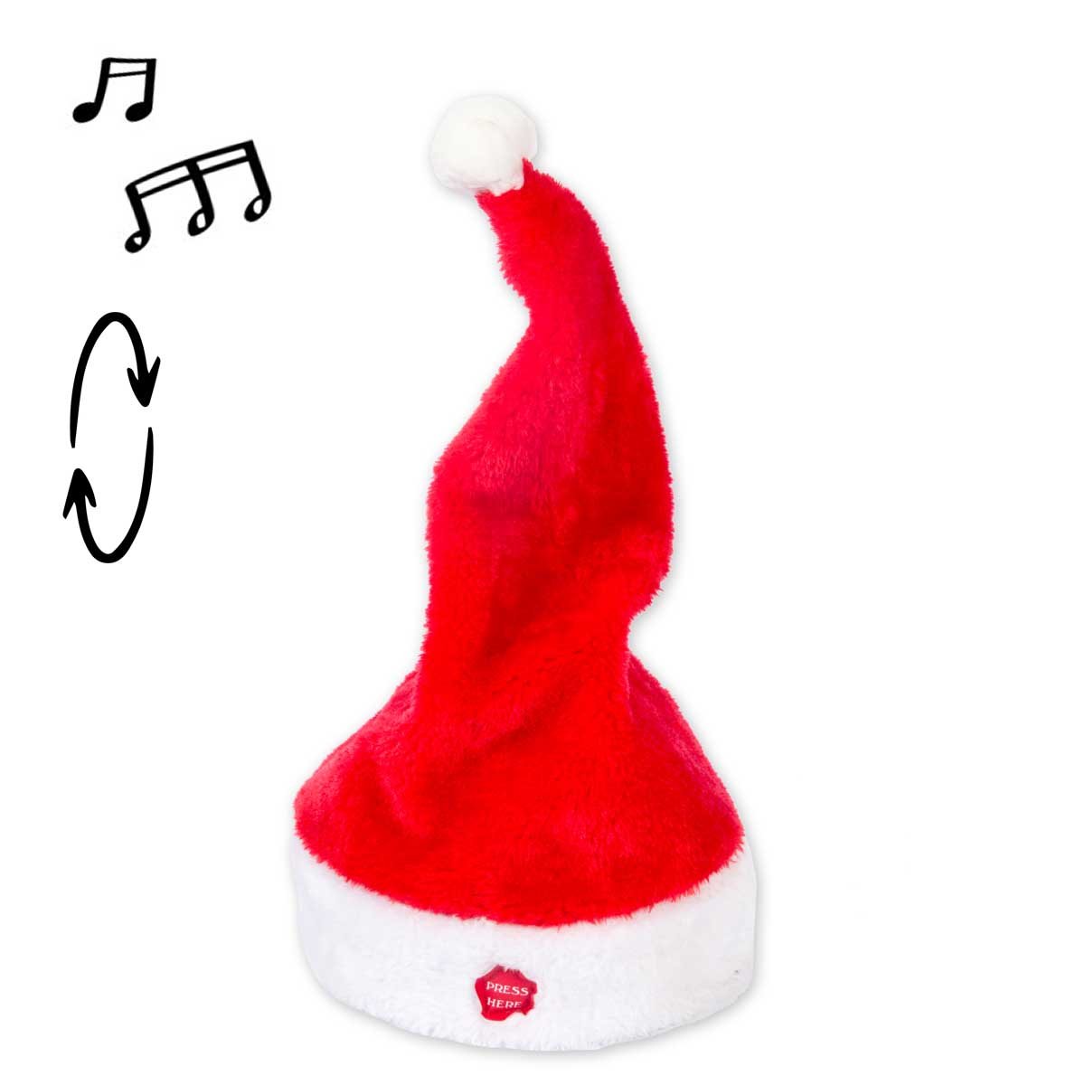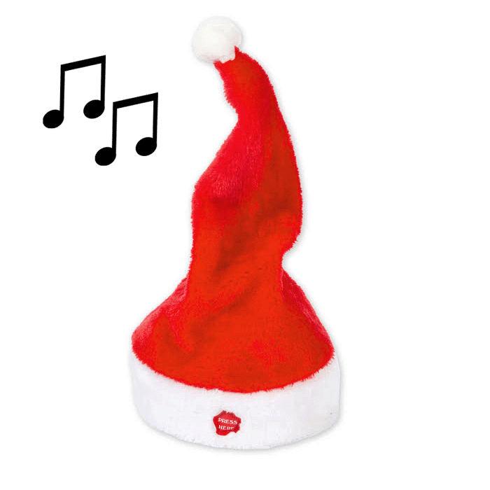 Glöm de gamla tomteluvorna som bara hänger på huvudet helt tysta, denna spelande tomteluvan både sjunger och dansar till tonerna av Merry Christmas samtidigt som toppen på luvan fladdrar fram och tillbaka dansandes.